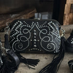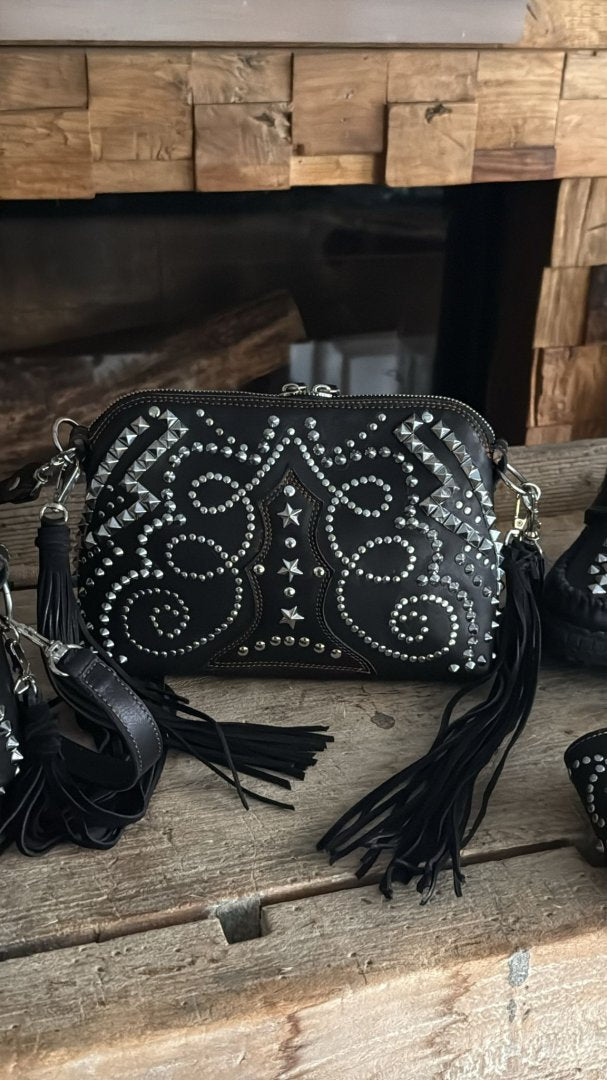 La borsa Briony è realizzata a mano in Toscana dai nostri artigiani, utilizzando pelle nera di alta qualità. Le borchie, applicate singolarmente a mano, creano un disegno geometrico esclusivo che la rende immediatamente riconoscibile. Le frange laterali aggiungono movimento e carattere a un design dal fascino deciso. Edizione limitata, ogni Briony è un pezzo unico.