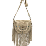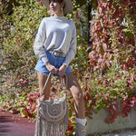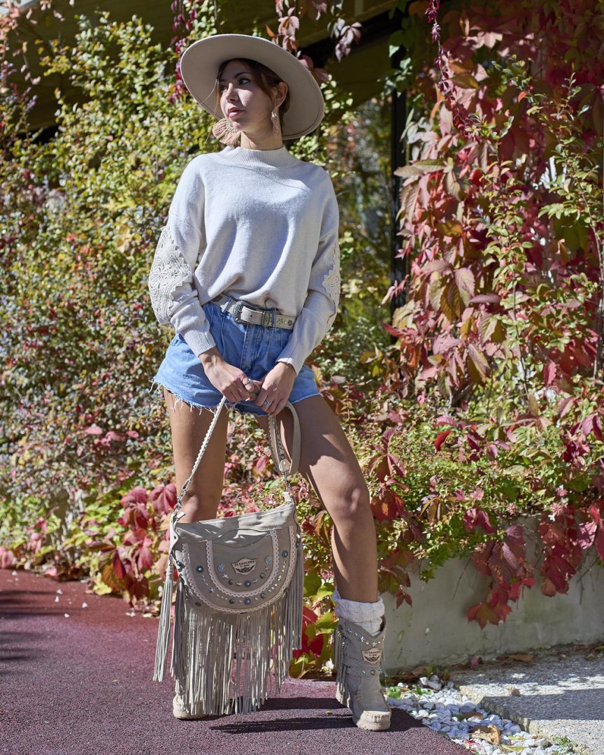 Hilary è la postina El Vaquero che unisce spirito ribelle e artigianalità toscana. Realizzata a mano in Toscana in una raffinata combinazione di pelle liscia e vitello scamosciato, è impreziosita da borchie inserite singolarmente a mano. La comoda tracolla in pelle, la chiusura con zip, le lunghe frange e i dettagli curati la rendono l’accessorio perfetto per chi cerca stile e carattere in ogni occasione.