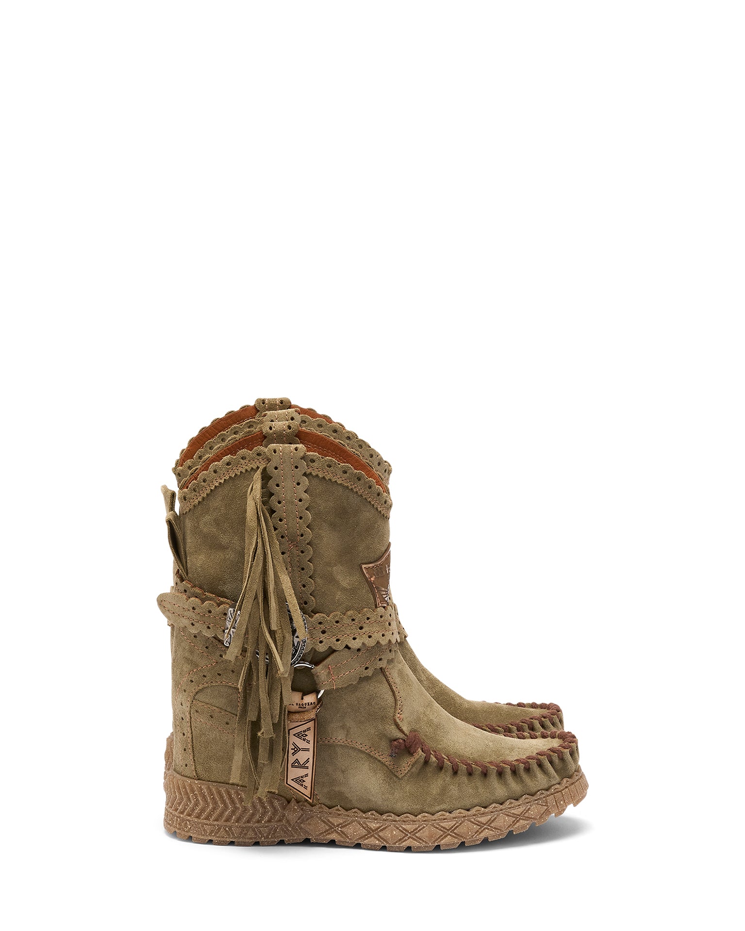 Icona e simbolo per eccellenza del marchio, Arya ha definito la storia più recente di El Vaquero diventando il personaggio principale del suo racconto di libertà e di spirito selvaggio. Realizzato con qualità impeccabile e la massima attenzione al dettaglio, Arya è caratterizzata dalle tipiche cuciture fatte a mano, frange laterali e dettagli metallici. Rifinito con il celebre lavaggio Silverstone, pietra miliare del marchio El Vaquero, che esalta ogni sfumatura della pelle nei suoi colori più intensi e rende ogni stivale diverso e unico nel suo genere.