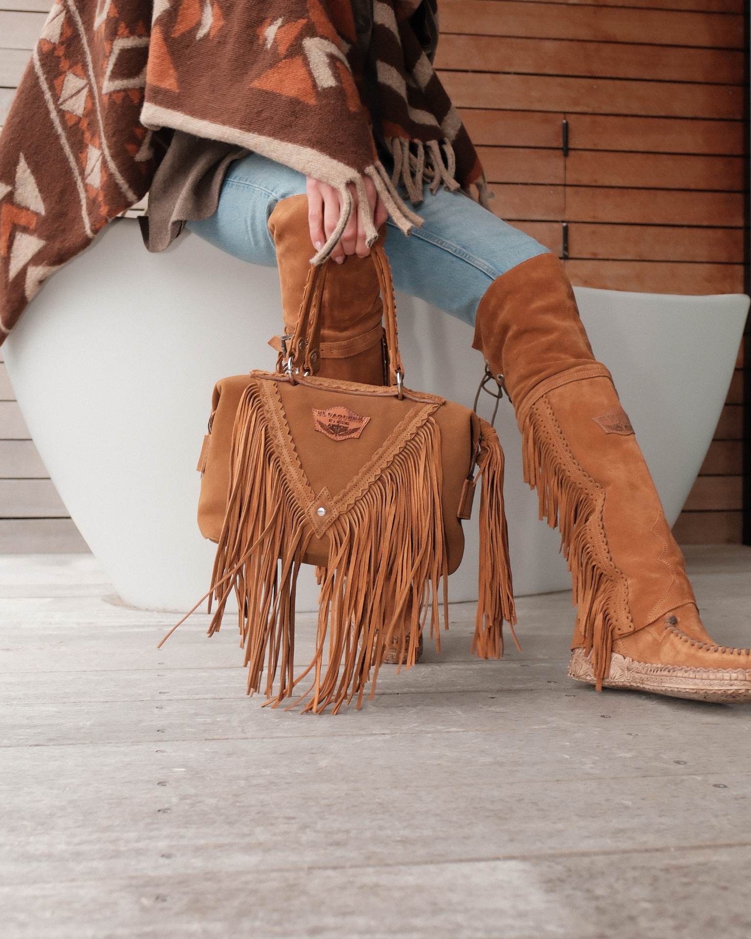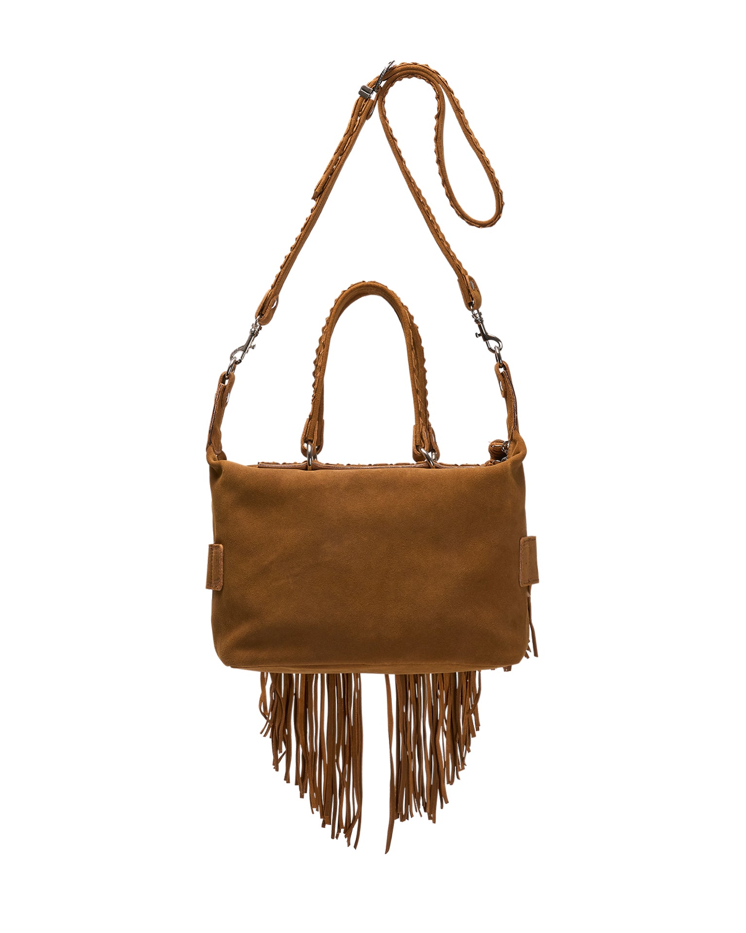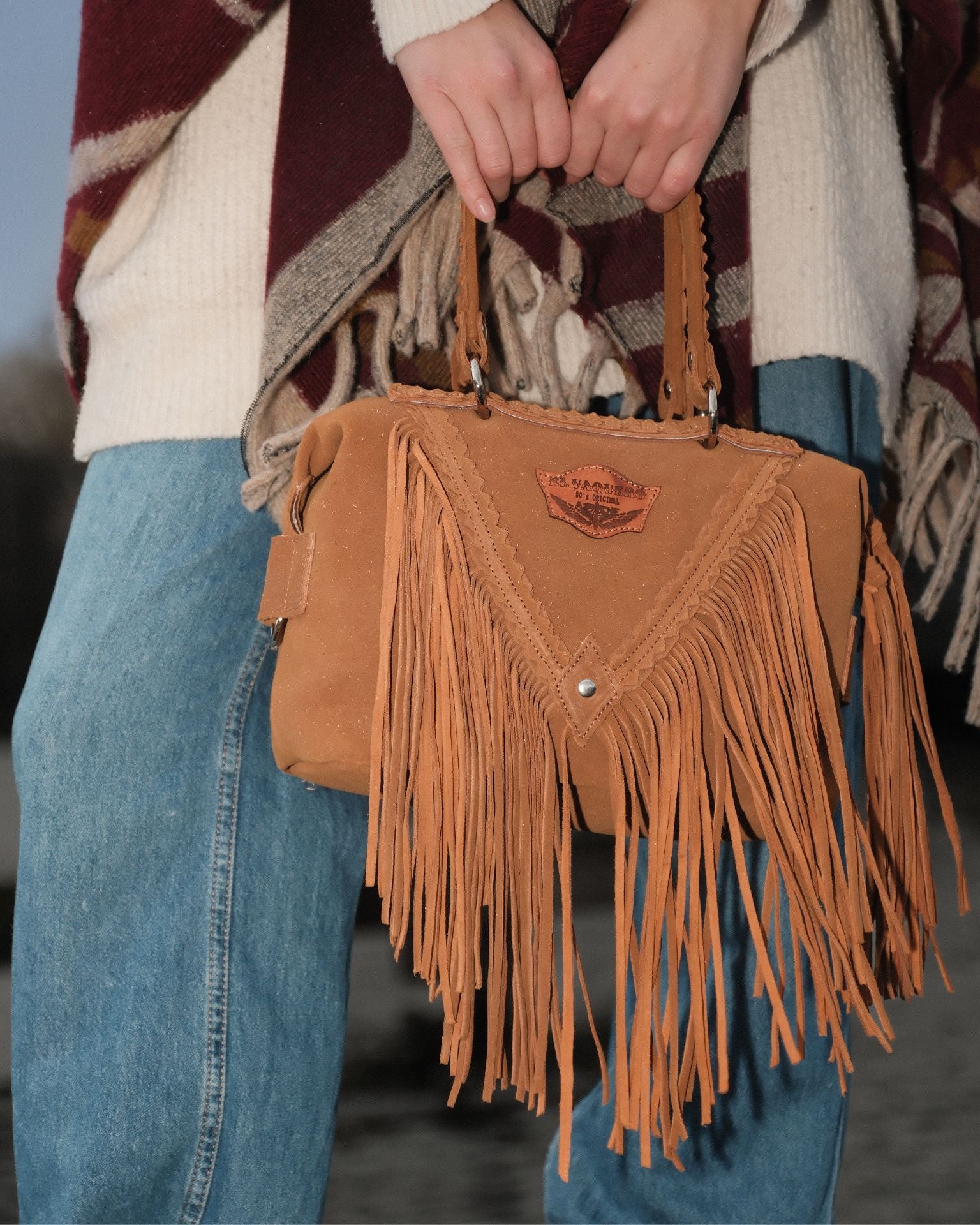 Byron è il nuovo bauletto El Vaquero, compatto ma sorprendentemente capiente, perfetto sia di giorno che di sera. Arricchito da lunghe frange, dettagli in pelle lavorata e inserti metallici, viene sottoposto al nostro esclusivo trattamento d’invecchiamento Silverstone, che dona alla pelle scamosciata affascinanti sfumature e variazioni cromatiche, rendendo ogni pezzo unico nel suo genere.