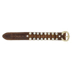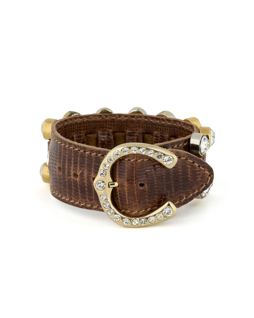 Il bracciale in pelle Lux in lucertolina stampata marrone è un accessorio prezioso dal carattere deciso. Gli strass sono incastonati a mano uno ad uno per un effetto luminoso e raffinato. Completa il design la fibbia in metallo El Vaquero, iconica e riconoscibile. Perfetto per aggiungere luce e personalità al tuo outfit El Vaquero.