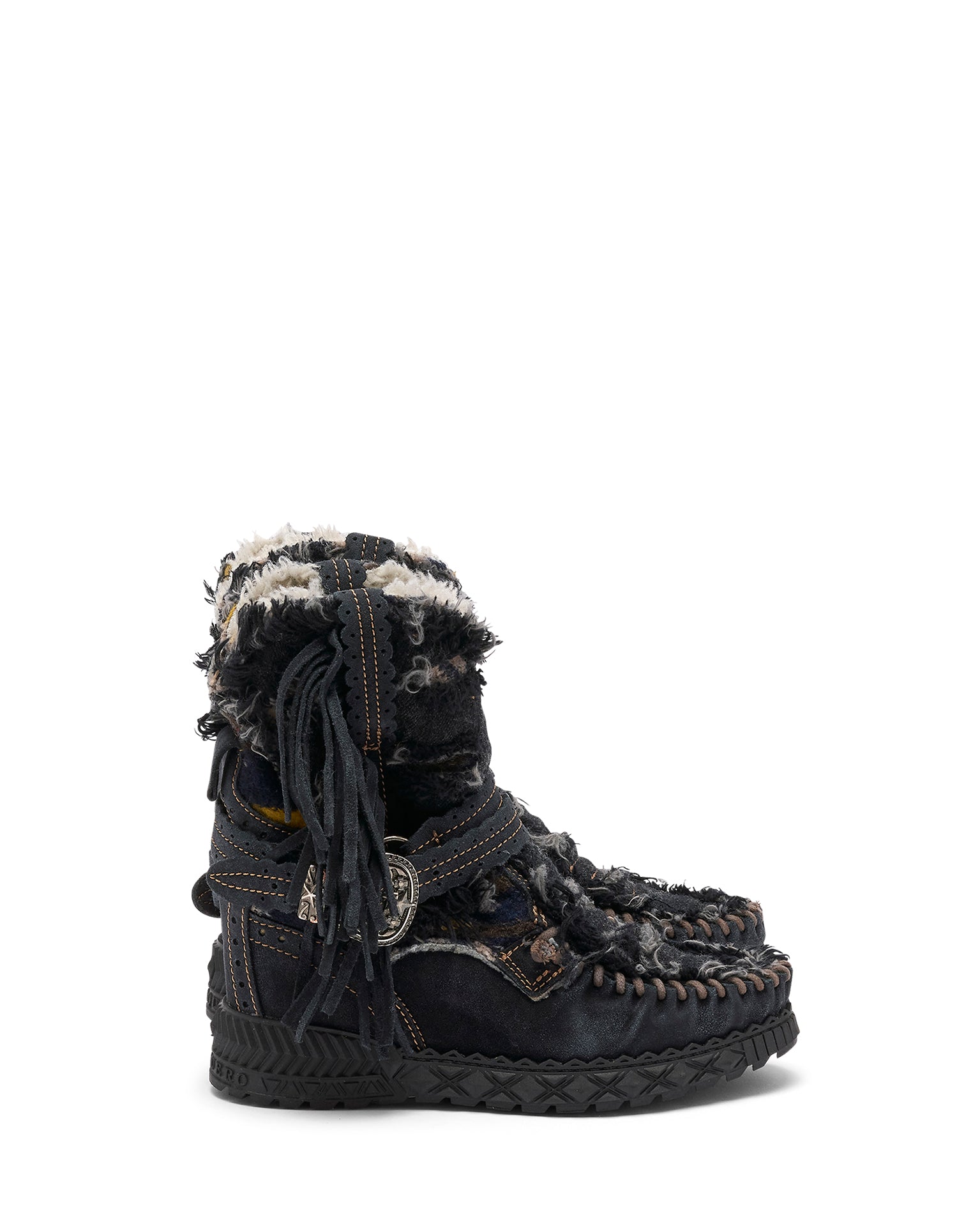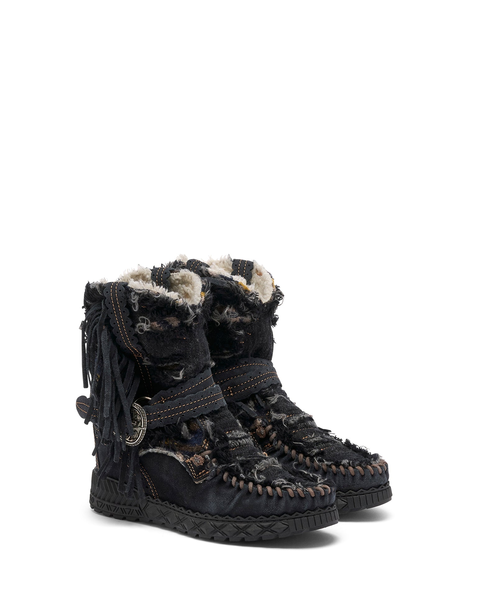 Il modello Arya Limited è realizzato in suede di alta qualità, e unisce denim e tessuti tribali in un design unico e senza tempo. Ogni paio è rifinito a mano e sottoposto a un lavaggio vintage che può lasciare leggere tracce e variazioni cromatiche sulla pelle: segni distintivi del processo artigianale, che rendono ogni creazione diversa dall’altra. La morbida fodera in pelliccia garantisce comfort e calore eccezionali.