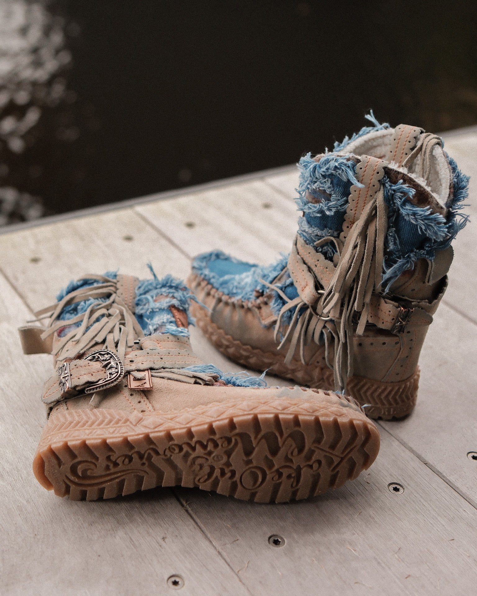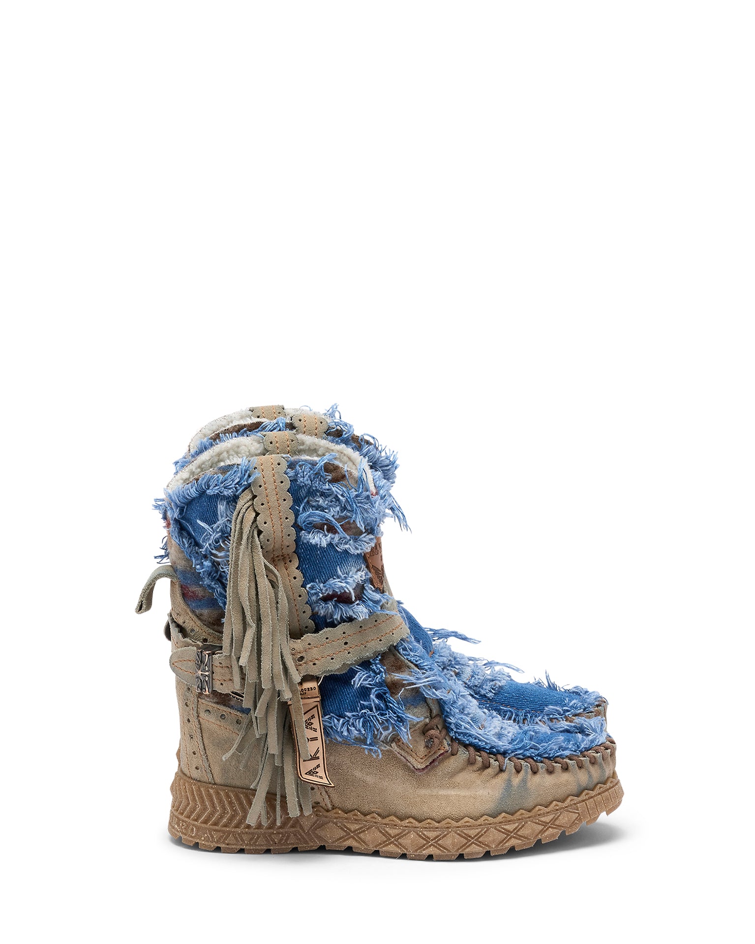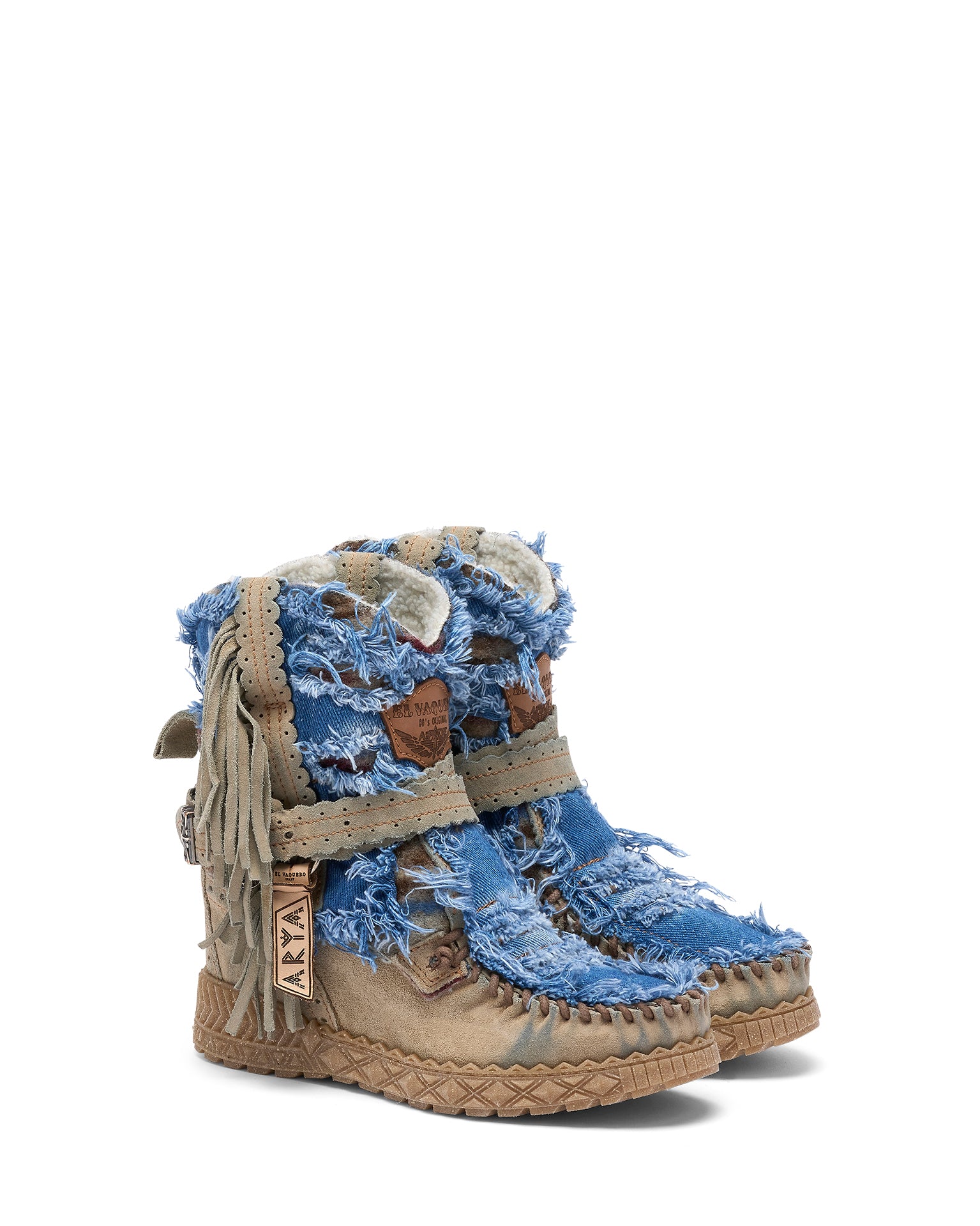 Il modello Arya Limited è realizzato in suede di alta qualità, e unisce denim e tessuti tribali in un design unico e senza tempo. Ogni paio è rifinito a mano e sottoposto a un lavaggio vintage che può lasciare leggere tracce e variazioni cromatiche sulla pelle: segni distintivi del processo artigianale, che rendono ogni creazione diversa dall’altra. La morbida fodera in pelliccia garantisce comfort e calore eccezionali.