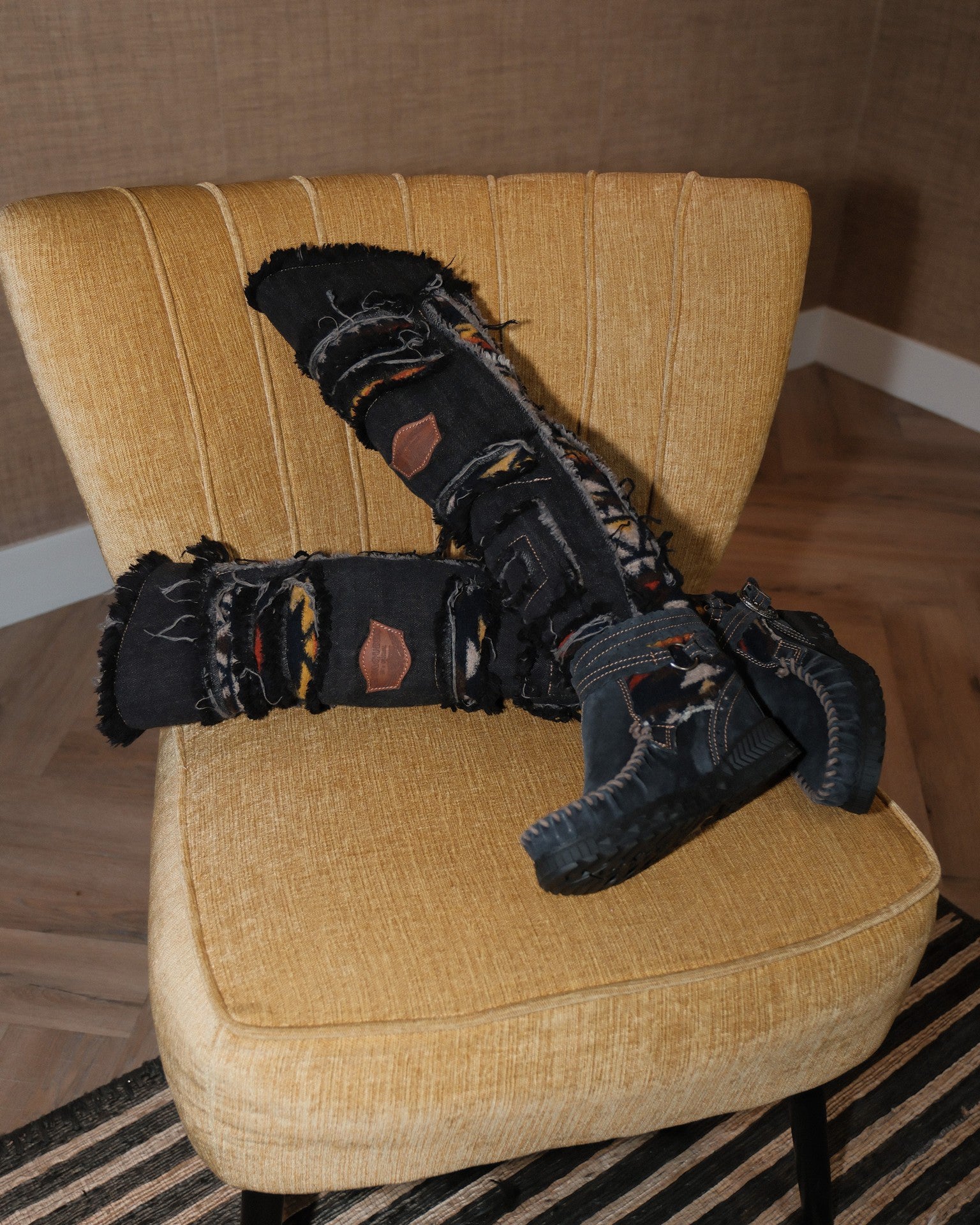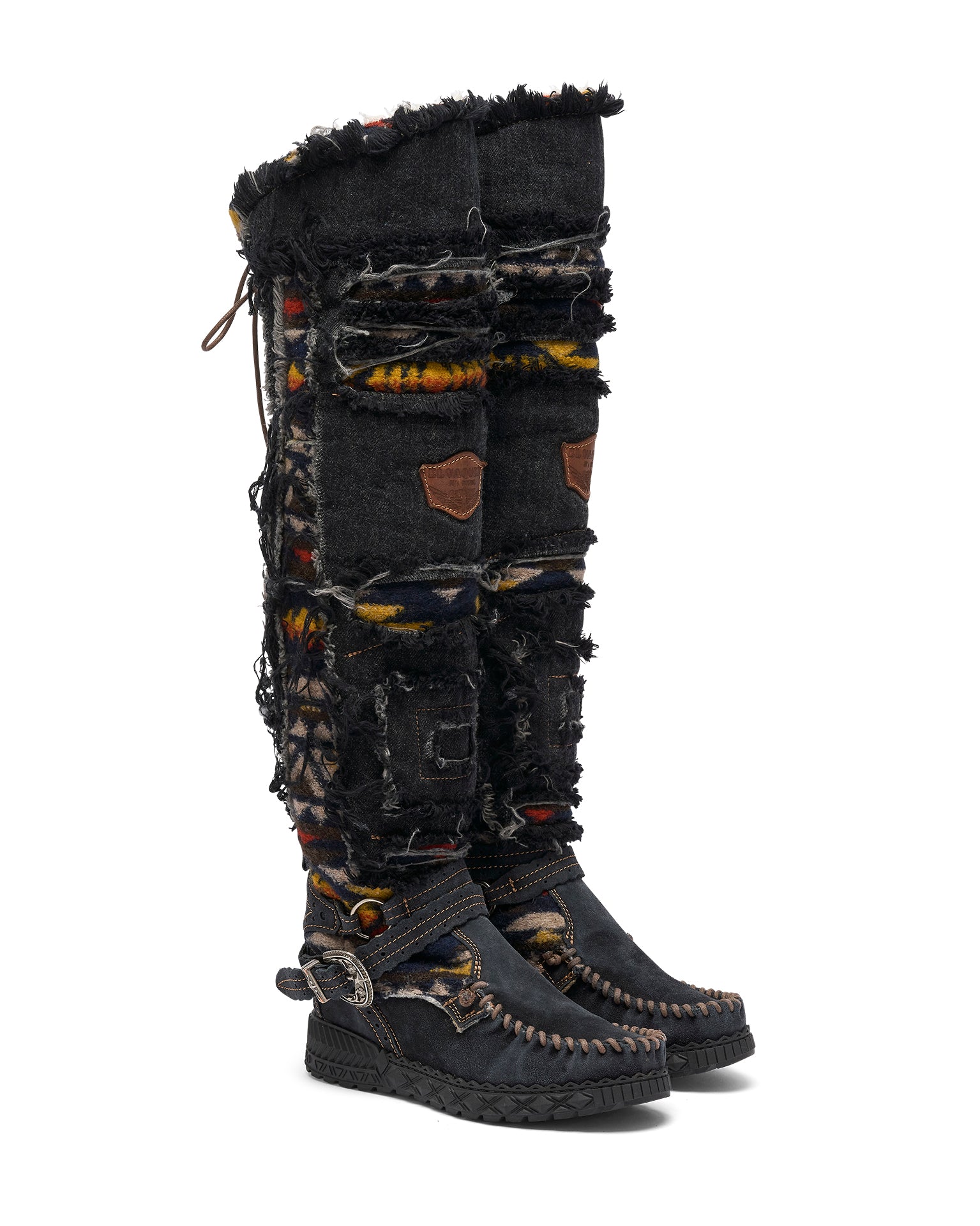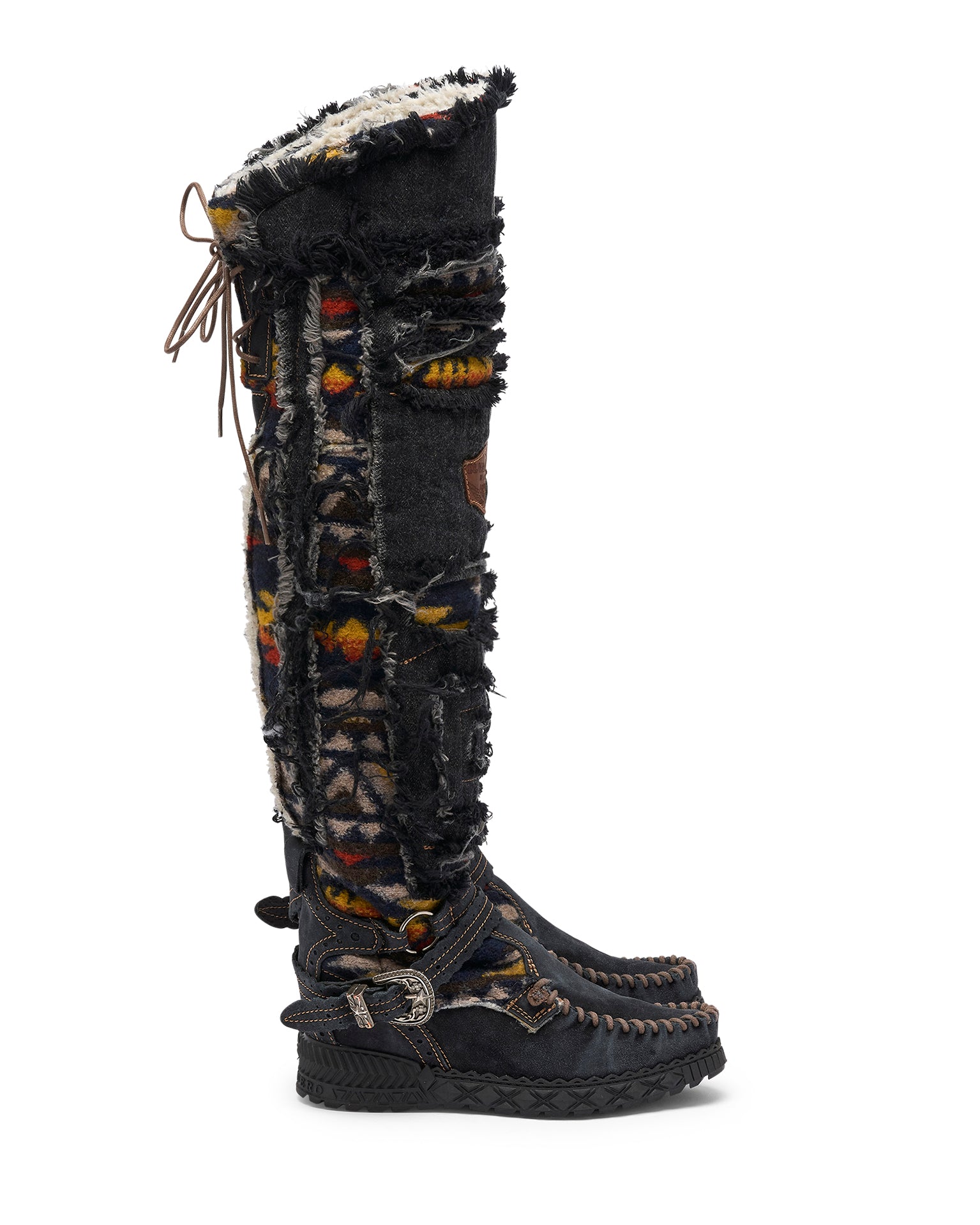 Il modello Clint è l’ultima novità della collezione di mocassini El Vaquero, parte di una Limited Edition esclusiva. Questo stivale over-the-knee unisce suede di alta qualità, denim e tessuti tribali, con cinturino alla caviglia e raffinati dettagli in pelle. Ogni paio è rifinito a mano e sottoposto a un lavaggio vintage che può creare leggere variazioni di colore, segni autentici della lavorazione artigianale. La morbida fodera in lana assicura comfort e calore eccezionali.