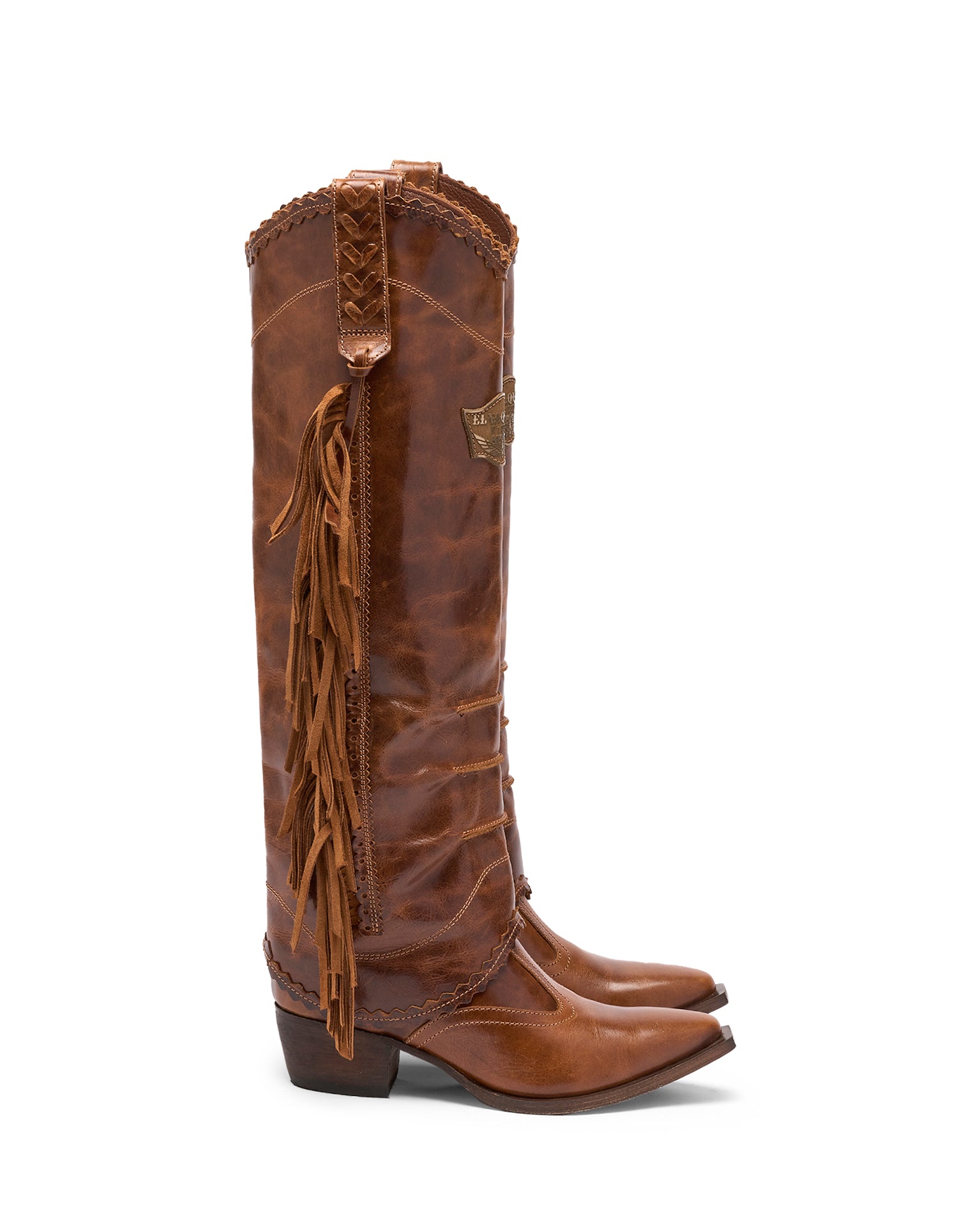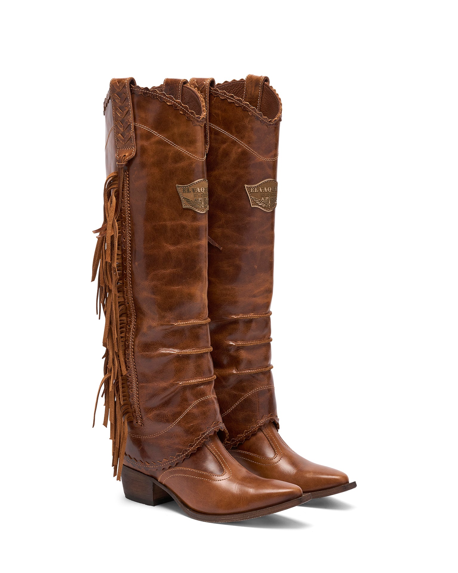 Kalou è lo stivale texano di El Vaquero alto al ginocchio, impreziosito da frange laterali e un doppio gambale che ne esalta il carattere audace. La nuova suola in cuoio con tacco di 4 cm e sottotacco in gomma antiscivolo garantisce eleganza e comodità, perfetto per chi ama un look distintivo. Realizzati in una spettacolare pelle di vitello cangiante con dettagli tono su tono spazzolati a mano, progettata per essere indossata ogni giorno in qualsiasi condizione climatica.