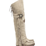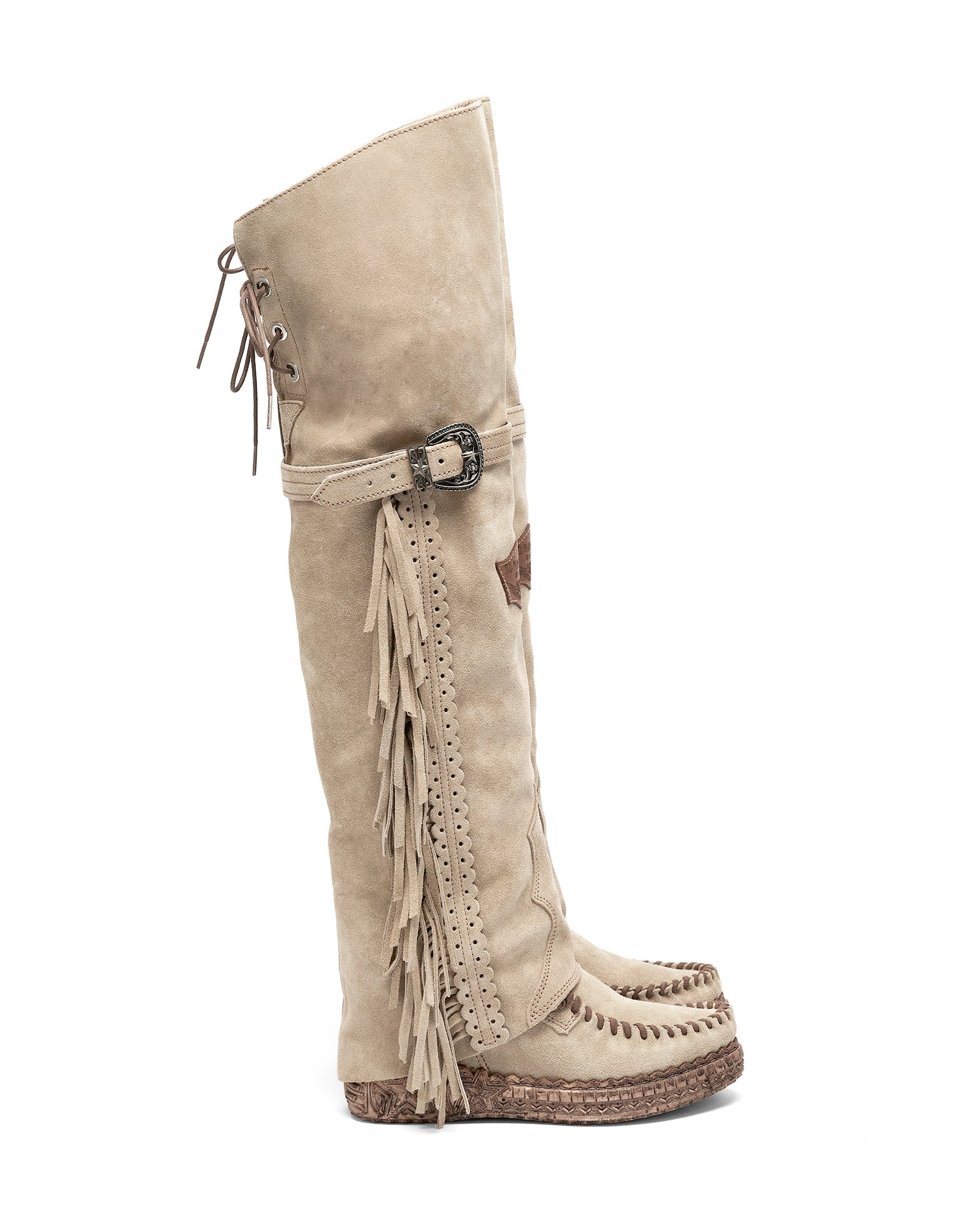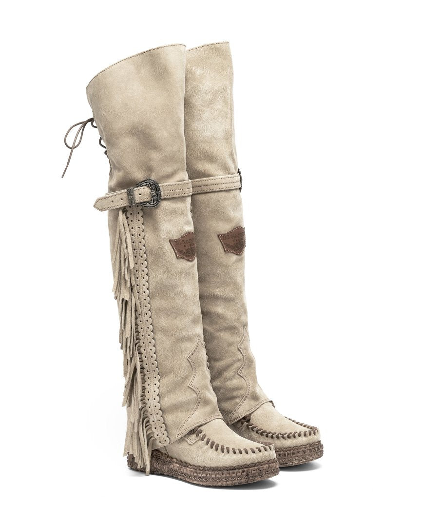 Lo stivale Coleen è un must-have nel guardaroba di ogni affezionato del marchio El Vaquero. Questo incredibile stivale si presenta con un doppio gambale alto fin sopra il ginocchio, tipiche cuciture artigianali, bellissime frange laterali e un'elegante allacciatura sul retro. Trattati e lavati delicatamente con il nostro lavaggio Silverstone che crea incredibili sfumature di colore sulla pelle scamosciata. Disponibile in questo caldo colore autunnale con dettagli in tono.