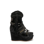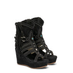 Amber is the perfect sandal for those who love to combine style and comfort. It combines the boho soul of an ankle boot with the open lines of a summer sandal, with a 10 cm wedge and 5 cm platform. The extra-comfort insole, adjustable lace, fringes and suede calfskin inserts make it ideal for any occasion. Finished with a leather lining for a luxurious feel with every step.