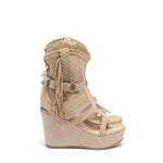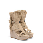 Amber is the perfect sandal for those who love to combine style and comfort. It combines the boho soul of an ankle boot with the open lines of a summer sandal, with a 10 cm wedge and 5 cm platform. The extra-comfort insole, adjustable lace, fringes and suede calfskin inserts make it ideal for any occasion. Finished with a leather lining for a luxurious feel with every step.