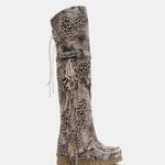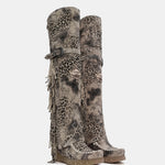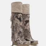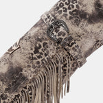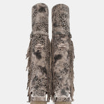 The Coleen boot is a must-have in the wardrobe of every El Vaquero brand aficionado. This double-shaft, over-the-knee boot features signature artisan stitching, beautiful side fringes, and an elegant lace-up back. Crafted from this beautiful material that blends the wild charm of leopard print with the elegance of marble patterns, adding a touch of exotic elegance to any design.