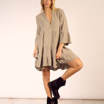 Veronique is the El Vaquero dress that combines simplicity, freedom and artisanal style. Handmade in Tuscany in garment-dyed cotton, it has a fluid line in one size, designed to adapt naturally to every body shape. The summer colors and light fabric make it ideal to wear with our boots, for a boho, fresh and authentic look.