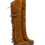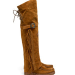 The Coleen boot is a must-have in every El Vaquero fan's wardrobe. This incredible boot features a double shaft that reaches above the knee, signature hand stitching, beautiful side fringing and a stylish lace-up back. Treated and gently washed with our Silverstone wash that creates incredible colour gradients on the suede. Available in this warm autumn colour with tonal details.