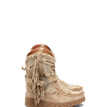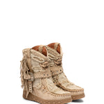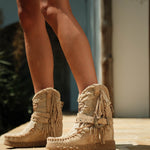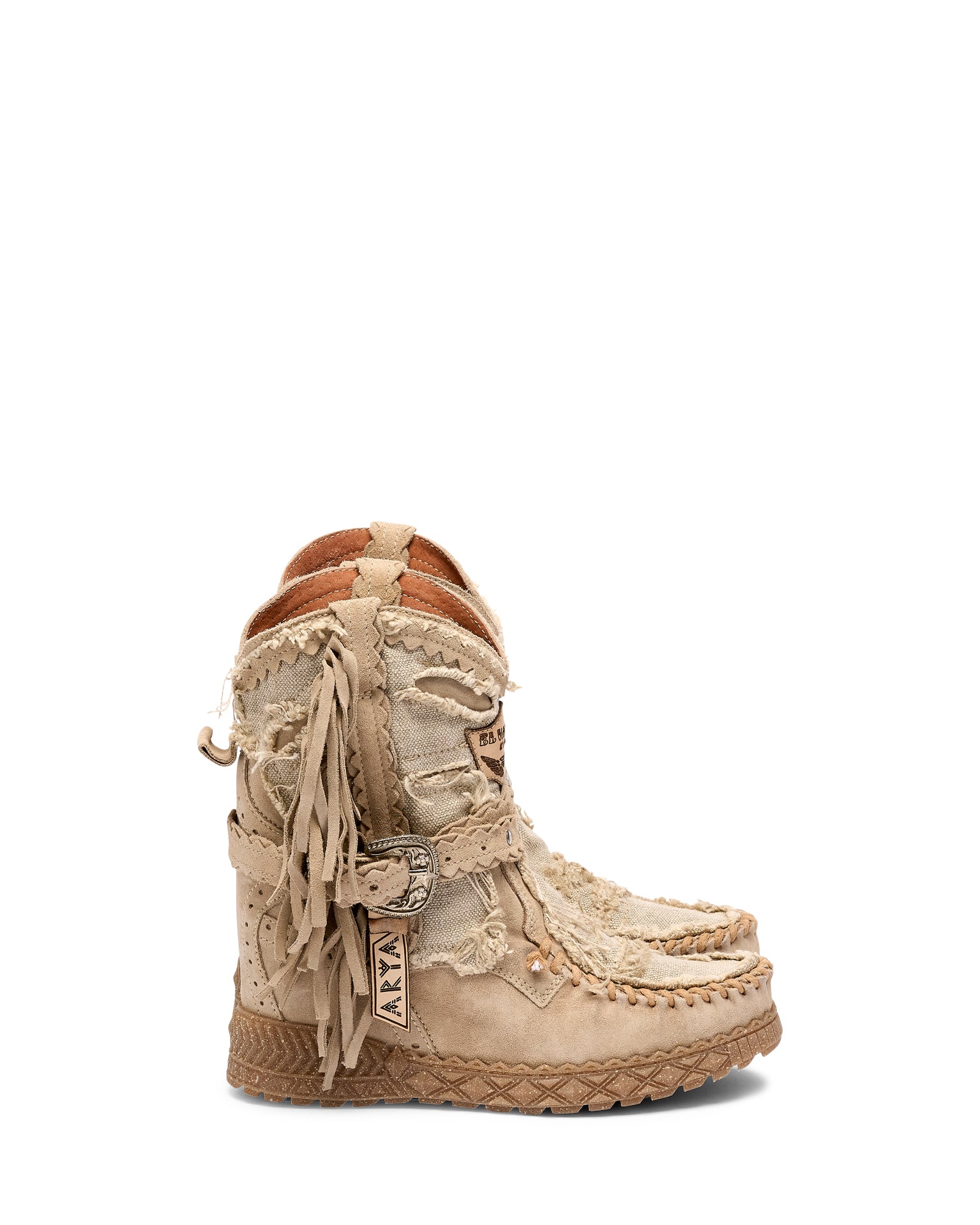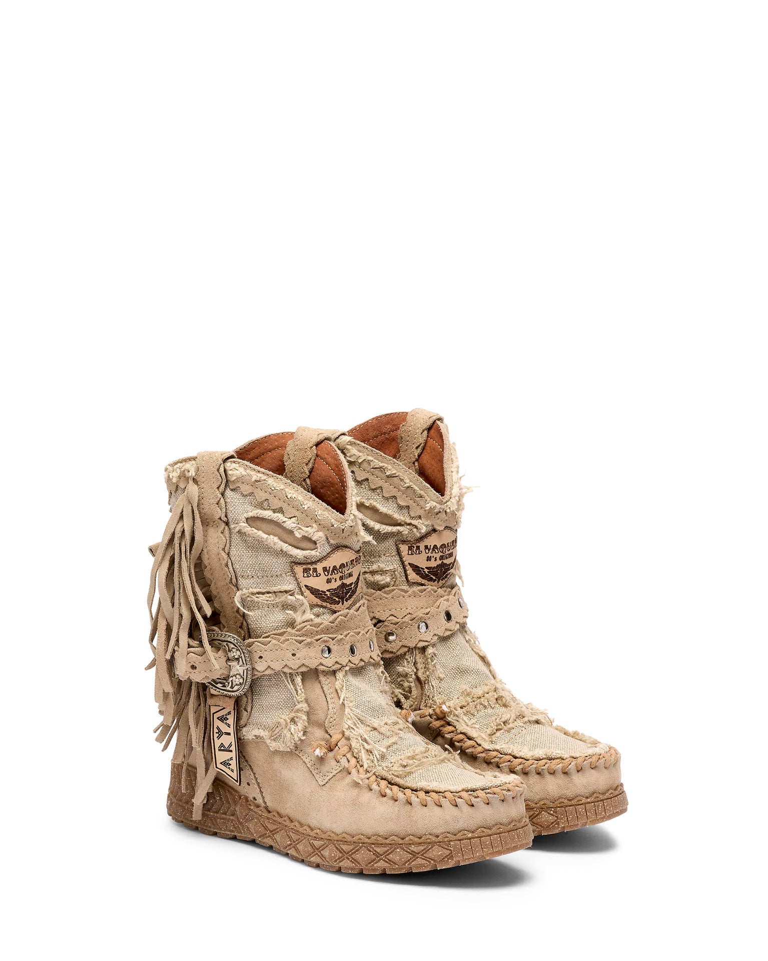 Icona e simbolo per eccellenza del marchio, Arya ha definito la storia più recente di El Vaquero diventando il personaggio principale del suo racconto di libertà e di spirito selvaggio. Realizzato con qualità impeccabile e la massima attenzione al dettaglio, Arya è caratterizzata dalle tipiche cuciture fatte a mano, frange laterali e dettagli metallici. Realizzati in una pelle scamosciata unita a pregiato lino naturale. Una combinazione fresca e leggera che unisce stile artigianale e comfort, perfetta per creazioni estive ed eleganti.