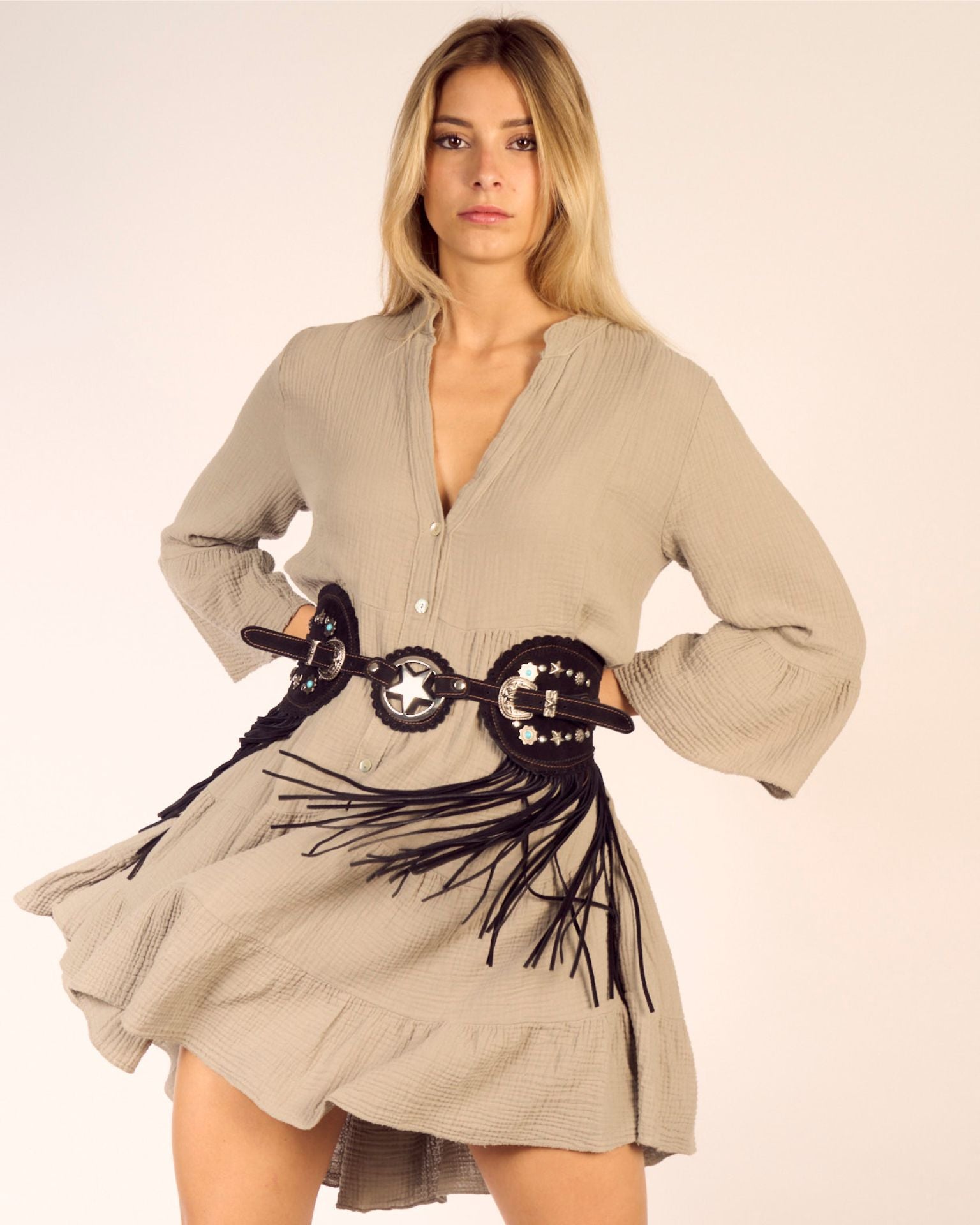 The Cara Studded belt by El Vaquero is part of our exclusive limited edition studded collection. Crafted from black calf suede, it is embellished with hand-applied studs, side fringes, a double buckle and a decorative central star. A handcrafted accessory with a strong Western character, perfect for completing boho and bold style looks.