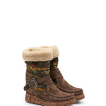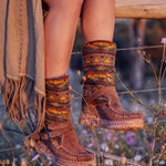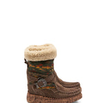 Ether is the El Vaquero moccasin boot ideal for winter. Gorgeous on the outside and warm and comfortable on the inside thanks to the soft cotton fur. Decorated with a simple ankle strap and thick artisan stitching, this model stands out for its 7 cm internal wedge and the versatility of being able to be worn both high on the leg and with the flap. Crafted in this revolutionary combination of premium suede calfskin and cotton fabric with a tribal pattern, lined internally with boiled wool fur.