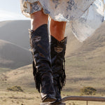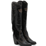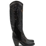 The Roxanne boot is one of the most elegant Texan boots by El Vaquero, featuring a knee-high shaft, soft fringes and beautiful leather details rigorously handmade. With its 7 cm heel, studs and turquoise embellishments, Roxanne is the best travel companion a woman could wish for. Featuring this spectacular combination of vegetal calfskin in python print specifically designed for our Texan line.