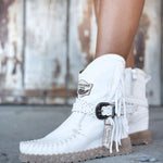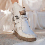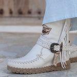 Queenie is our elegant ankle boot, made in a limited edition in collaboration with IbizaMode. Designed to stand out with its unique style, it features side fringes, a practical internal zip and delicate lace trims. Queenie perfectly combines bohemian charm with timeless elegance, making it a must-have for those looking for a unique and sophisticated touch in their wardrobe.
