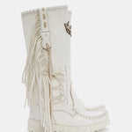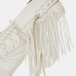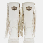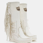 The Billie mid-calf boot features a 7cm internal wedge, soft fringes, beautiful leather side tabs and thick hand-stitched toe box stitching, a signature of the El Vaquero brand. Crafted from soft, premium ivory white cowhide leather hand-selected by El Vaquero’s Head Designer, the new Optical combination provides a classy, elegant monochromatic look.