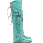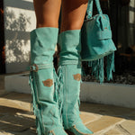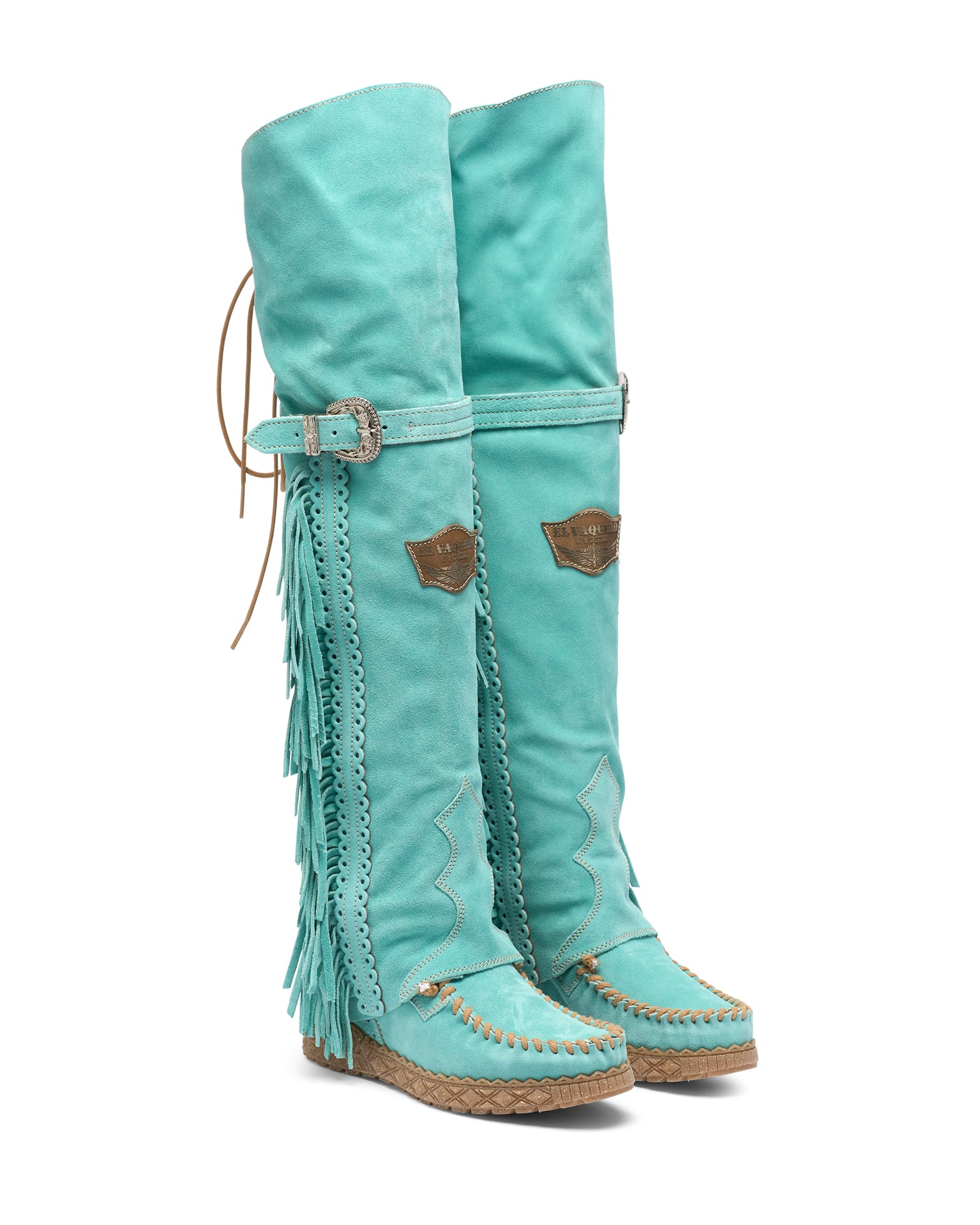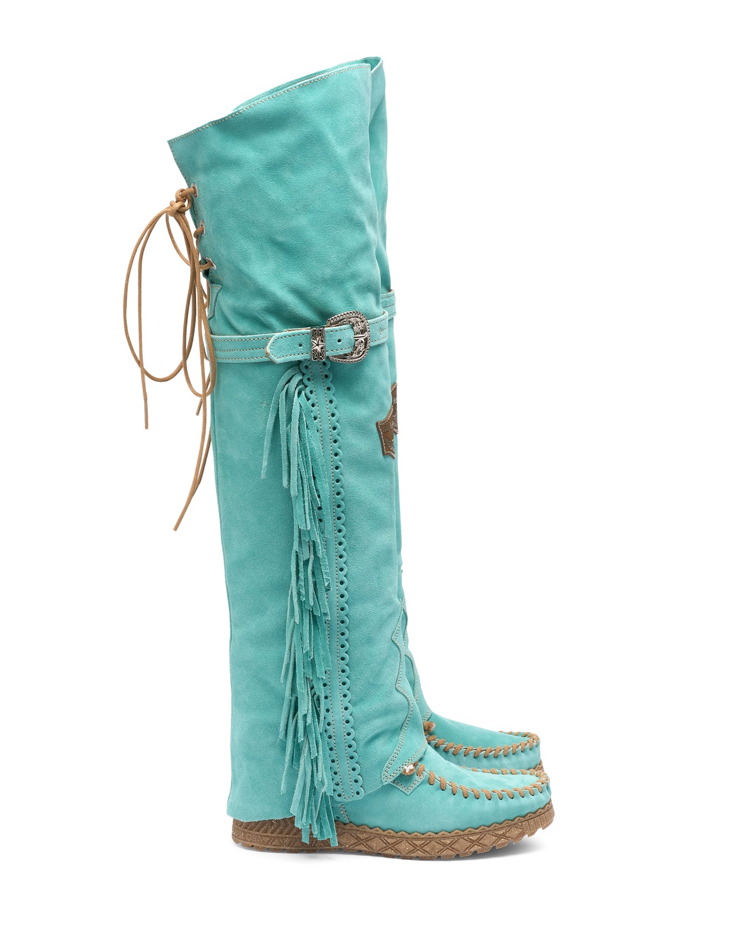 Coleen è uno stivale immancabile nel guardaroba di ogni amante dello stile El Vaquero. Il doppio gambale alto sopra il ginocchio, le iconiche cuciture artigianali, le frange laterali e l’elegante allacciatura posteriore lo rendono un modello unico e intramontabile. Realizzato in questa pelle di vitello scamosciato con finitura vintage, esaltato dal celebre lavaggio Silverstone. Ogni pelle è unica, con sfumature intense e un effetto vissuto che racconta una storia.