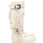 Lo stivale a mocassino Joplin è caratterizzato da zeppa interna di 7 cm, morbide frange, elementi metallici a forma di stella e spesse cuciture fatte a mano sulla vaschetta, segno distintivo del marchio El Vaquero. Realizzati in questa bellissima ed elegante pelle bovina color bianco avorio che dona un tocco innovativo ma allo stesso tempo classico allo stivale.