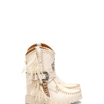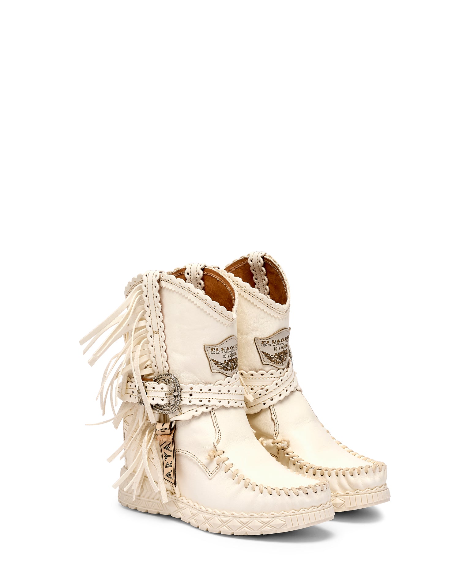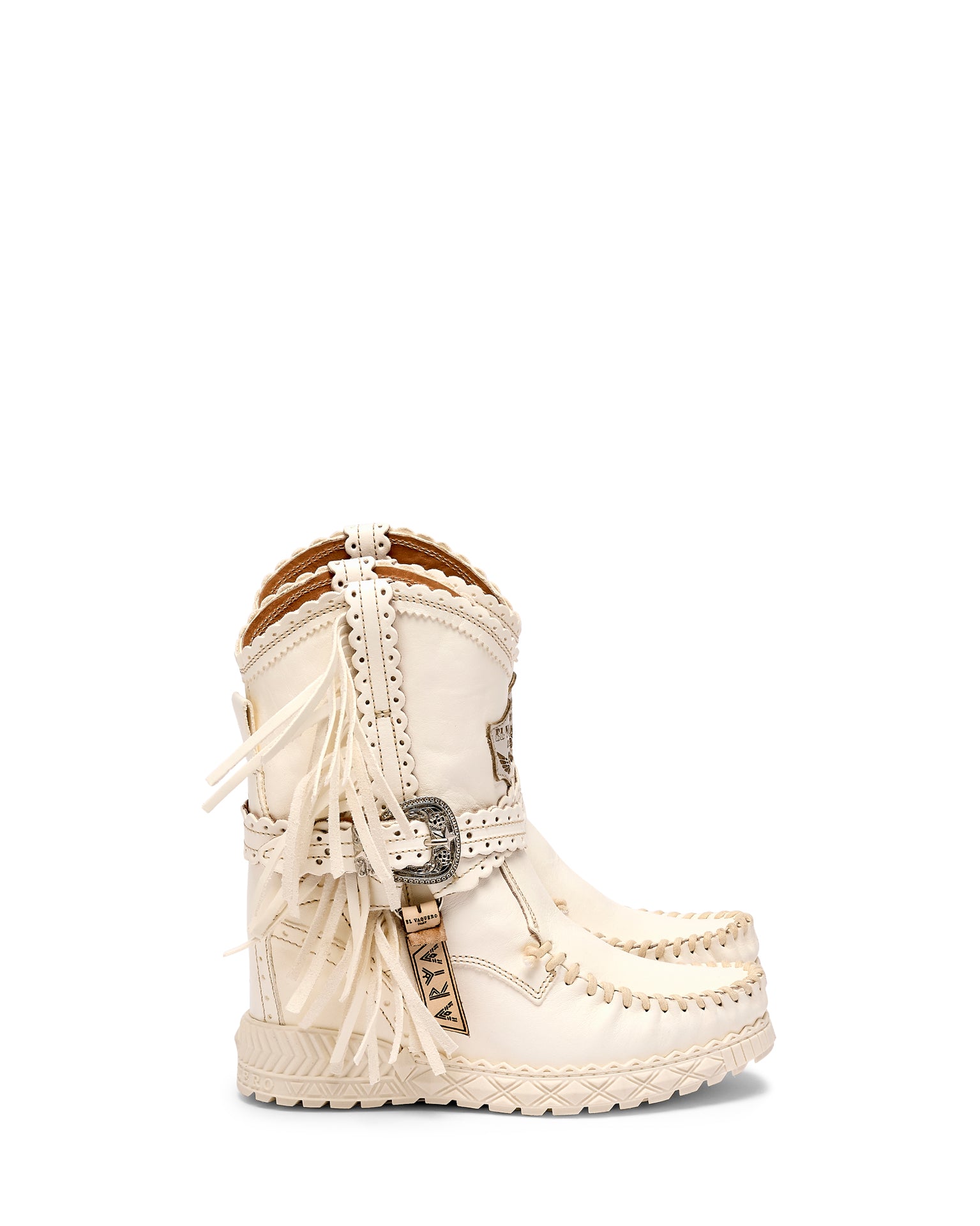 Icona e simbolo per eccellenza del marchio, Arya ha definito la storia più recente di El Vaquero diventando il personaggio principale del suo racconto di libertà e di spirito selvaggio. Realizzato con qualità impeccabile e la massima attenzione al dettaglio, Arya è caratterizzata dalle tipiche cuciture fatte a mano, frange laterali e dettagli metallici. Realizzati in una pelle di vitello naturale bianca, incredibilmente morbida al tatto. Un materiale raffinato che dona un look intramontabile ma al tempo stesso moderno, perfetto per creazioni eleganti e minimal.