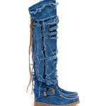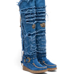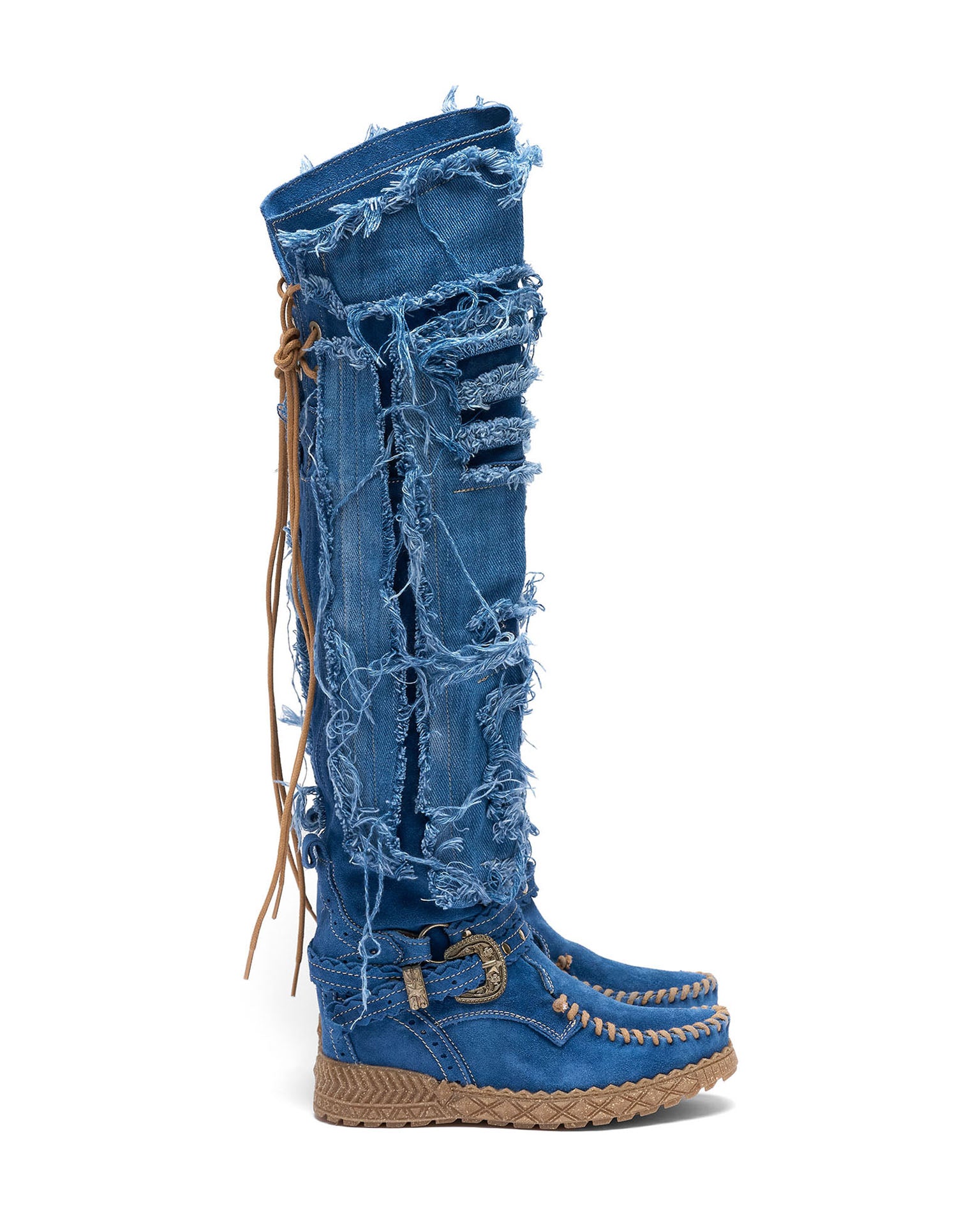 Clint è lo stivale over-the-knee che si distingue per il cinturino alla caviglia e i raffinati dettagli in pelle lungo il gambale, espressione di artigianalità e stile inconfondibile. Questo pellame è caratterizzato da una innovativa fusione tra vitello scamosciato e denim. Le finiture stone-wash e i dettagli etnici creano un effetto vintage rivoluzionario, pensato per ridefinire il mondo del jeans.