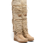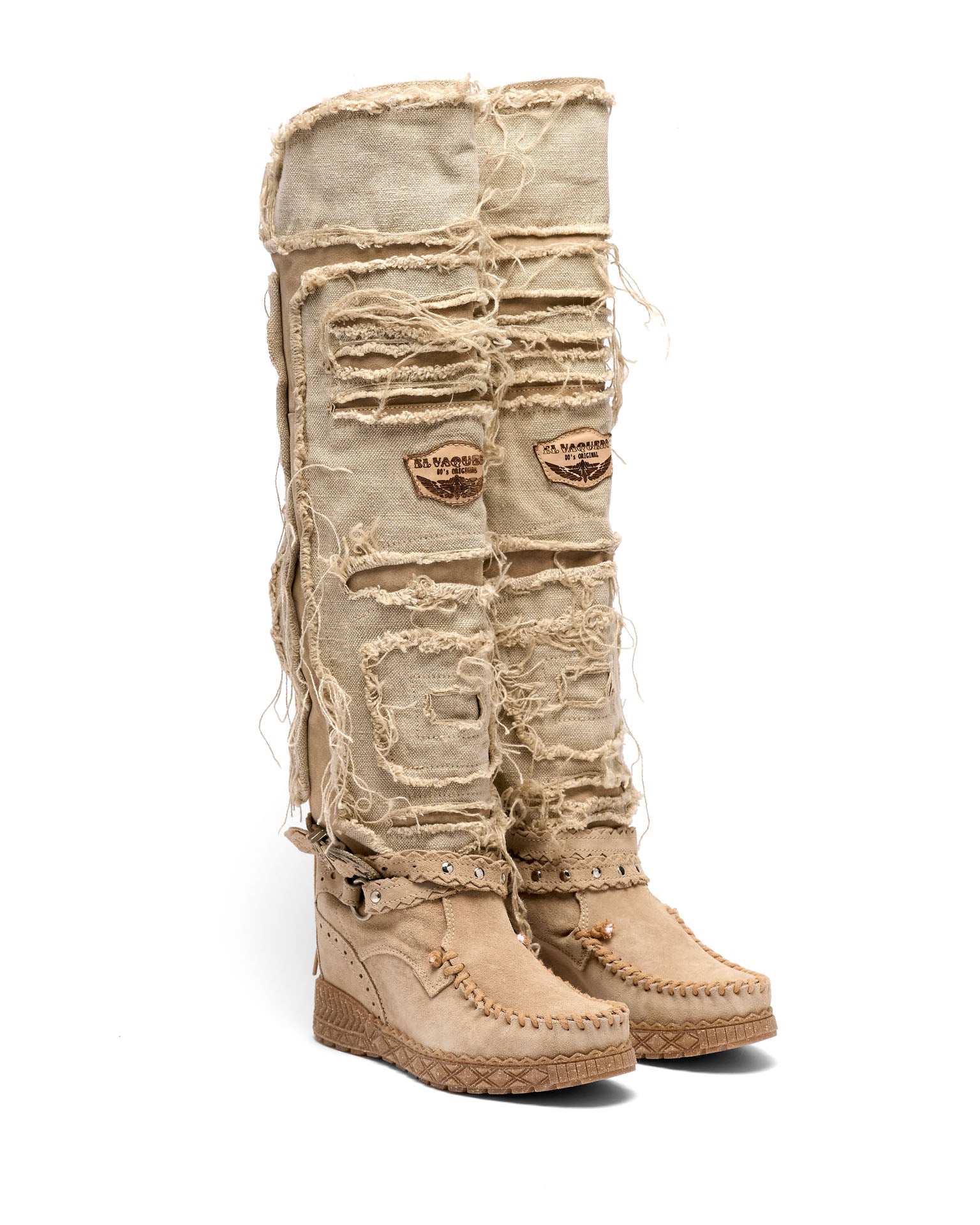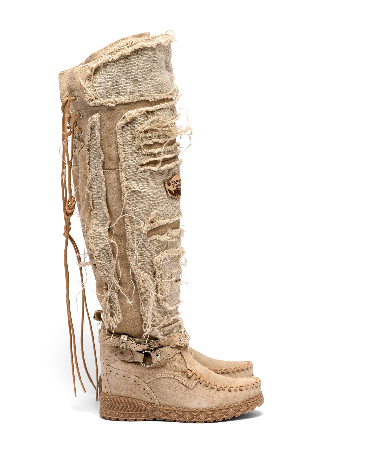 Clint è lo stivale over-the-knee che si distingue per il cinturino alla caviglia e i raffinati dettagli in pelle lungo il gambale, espressione di artigianalità e stile inconfondibile. Realizzati in una pelle scamosciata unita a pregiato lino naturale. Una combinazione fresca e leggera che unisce stile artigianale e comfort, perfetta per creazioni estive ed eleganti.