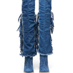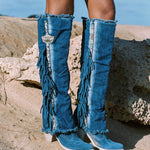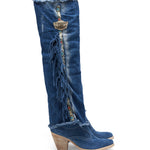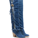 Bonnie is the new incredible Texan over-the-knee model made exclusively in the Atomic Jeans combination. Featuring a comfortable 7 cm heel, double shaft, leather details with ethnic motifs and an inimitable vintage effect given by the Jeans rips.