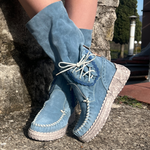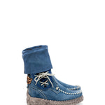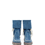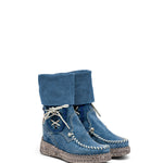 Brenda is one of our moccasin ankle boots featuring thick hand-stitched seams on the vamp, a 7 cm internal wedge, braided laces on the sides and an original shaft that can be folded. Crafted from this incredibly soft and elegant suede that represents the colors and shades of the sea and its beaches. The beautiful shades of the leather are the result of a combination of three colors mixed and washed together.