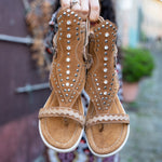 Naia is the real novelty of this season, a flat sandal that perfectly combines style and comfort, characterized by a back strap and beautiful hand-inserted details. What makes this model truly special are the studs and Swarovski crystals that make it one of a kind. Available in this very delicate brown color with shades given by our stone-wash treatment.