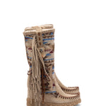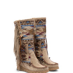 Lo stivale a metà gamba Billie è caratterizzato da zeppa interna di 7 cm, morbide frange, bellissimi ditteagli in pelle laterali e spesse cuciture fatte a mano sulla vaschetta, segno distintivo del marchio El Vaquero. Realizzati in una straordinaria combinazione di camoscio di vitello di prima qualità e tessuto in cotone ispirato alla tradizione nativa, foderato con morbida pelliccia di lana cotta.