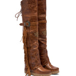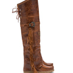 Lo stivale Coleen è un must-have nel guardaroba di ogni affezionato del marchio El Vaquero. Questo stivale con doppio gambale alto sopra il ginocchio presenta le tipiche cuciture artigianali, bellissime frange laterali e un'elegante allacciatura sul retro. Realizzati in una spettacolare pelle di vitello cangiante con dettagli tono su tono spazzolati a mano, progettata per essere indossata ogni giorno in qualsiasi condizione climatica.