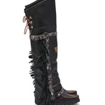 Lo stivale Coleen è un must-have nel guardaroba di ogni affezionato del marchio El Vaquero. Questo stivale con doppio gambale alto sopra il ginocchio presenta le tipiche cuciture artigianali, bellissime frange laterali e un'elegante allacciatura sul retro. Creati in una morbidissima pelle di vacchetta di prima qualità in nero, arricchita da dettagli in vitello stampato effetto pitone, per una combinazione grintosa ma al contempo elegante e raffinata.