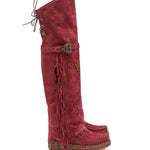 The Coleen boot is a must-have in every El Vaquero fan's wardrobe. This incredible boot features a double shaft that reaches above the knee, signature hand stitching, beautiful side fringing and a stylish lace-up back. Treated and gently washed with our Silverstone wash that creates incredible colour gradients on the suede. Available in this warm autumn colour with tonal details.