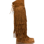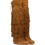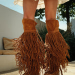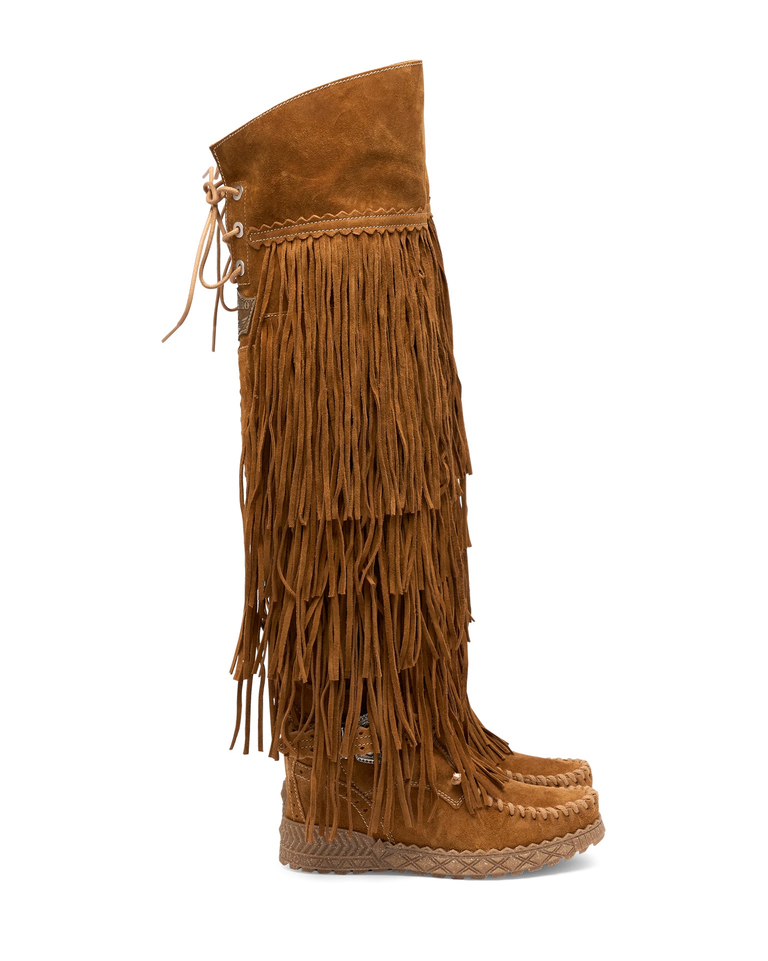 Esme è lo stivale al ginocchio firmato El Vaquero che incarna lo spirito libero del boho-western. Con zeppa interna da 7 cm, allacciatura posteriore regolabile e una cascata di frange su più livelli, è impreziosito da cuciture artigianali e dettagli intagliati. Un modello scenografico, pensato per chi ama distinguersi con stile. Realizzato in questa pelle di vitello scamosciato con finitura vintage, esaltato dal celebre lavaggio Silverstone. Ogni pelle è unica, con sfumature intense e un effetto vissuto che racconta una storia.