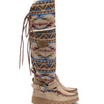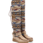 Celebre per il suo alto gambale fino al ginocchio, lo stivale Huntress rappresenta uno dei bestseller di punta del marchio. Dotato di una zeppa interna di 7 cm, un comodo cinturino alla caviglia e cuciture artigianali, questo stivale a mocassino si distingue per la sua semplicità ed eleganza. Realizzati in questa rivoluzionaria combinazione di pelle di vitello scamosciato di prima qualità e tessuto di cotone con pattern tribale, foderati internamente con pelliccia di lana cotta.