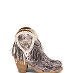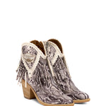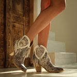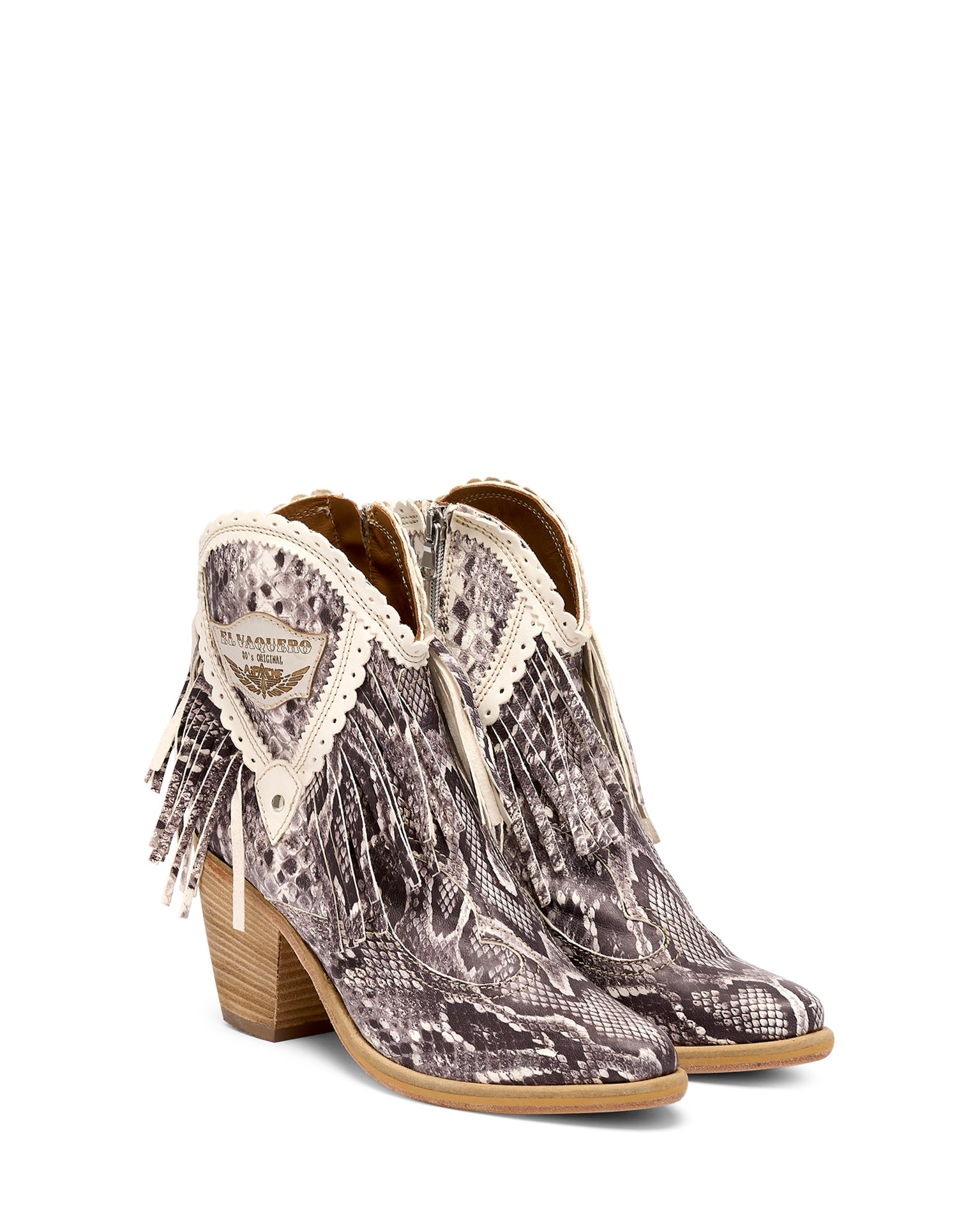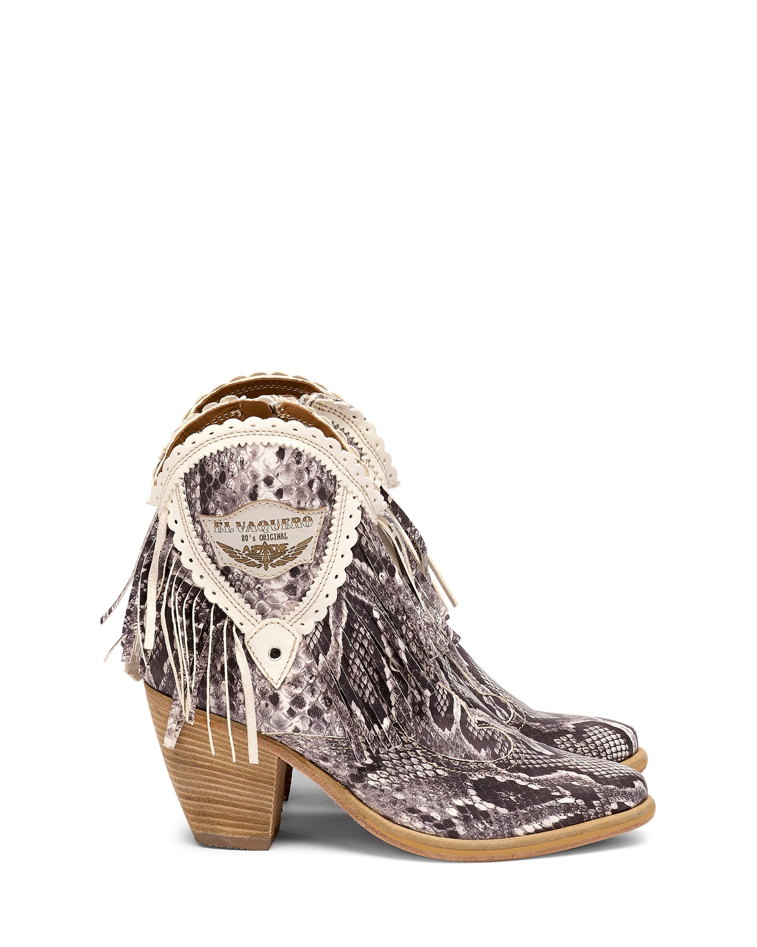 Kaley è lo stivaletto texano El Vaquero dal carattere deciso e femminile. Dotato di un comodo tacco da 7 cm, presenta ricami western, frange decorative sul collo del piede e finiture traforate che richiamano la tradizione artigianale del marchio. Realizzato in una pelle di vitello naturale bianco con stampa pitonata, un mix esclusivo tra la morbidezza della pelle e la grinta del pattern. Perfetta per look audaci con un tocco di lusso esotico.