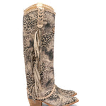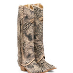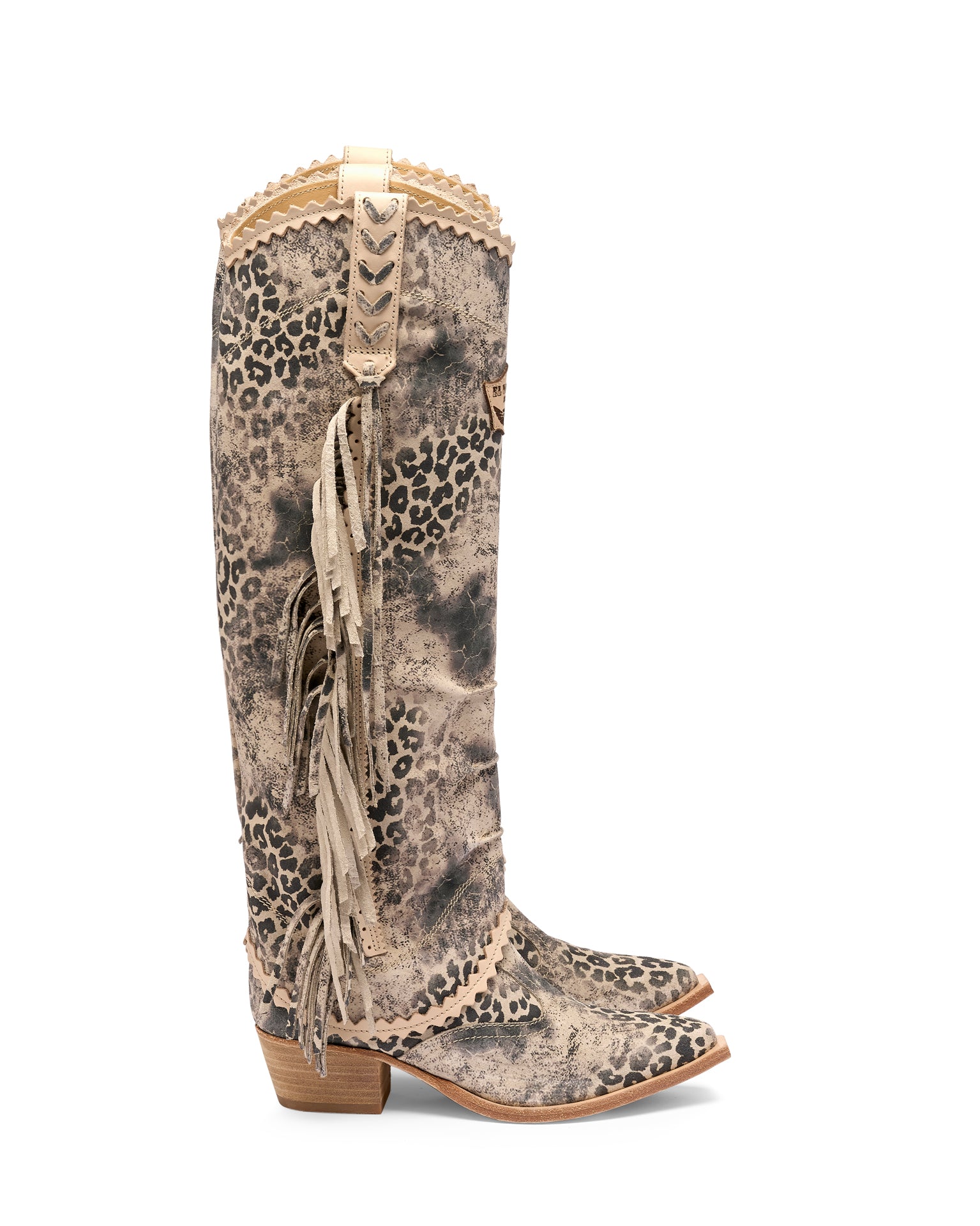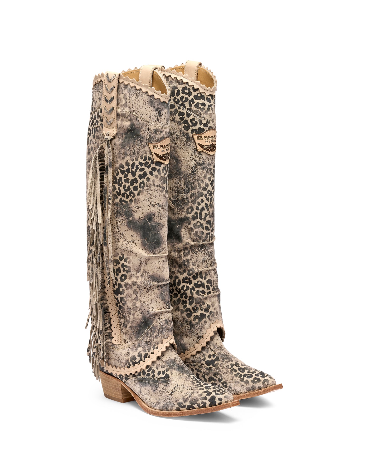 Kalou è lo stivale texano di El Vaquero alto al ginocchio, impreziosito da frange laterali e un doppio gambale che ne esalta il carattere audace. La nuova suola in cuoio con tacco di 4 cm e sottotacco in gomma antiscivolo garantisce eleganza e comodità. Realizzato in questa pelle scamosciata con stampa leopardata effetto marmo. Un connubio originale tra selvaggia eleganza e raffinatezza artistica, per creazioni audaci e di grande impatto visivo.