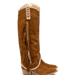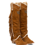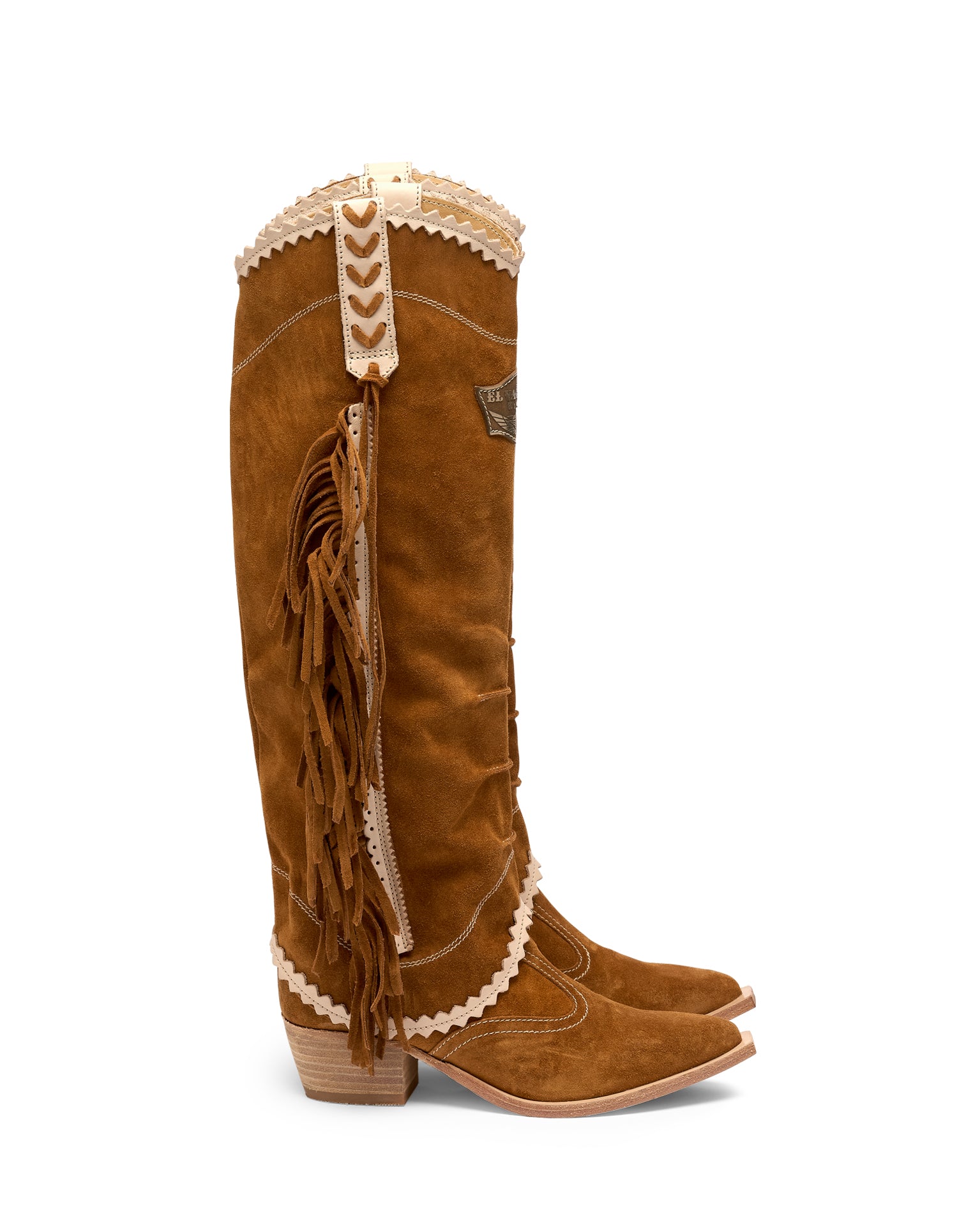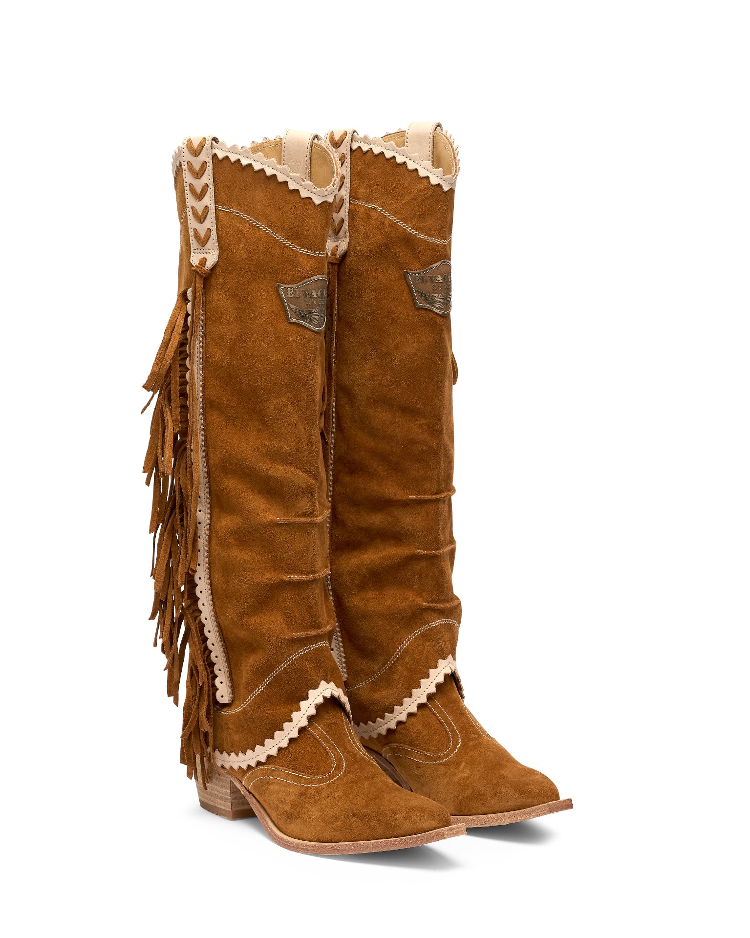Kalou è lo stivale texano di El Vaquero alto al ginocchio, impreziosito da frange laterali e un doppio gambale che ne esalta il carattere audace. La nuova suola in cuoio con tacco di 4 cm e sottotacco in gomma antiscivolo garantisce eleganza e comodità. Realizzato in questa pelle di vitello scamosciato con finitura vintage, esaltato dal celebre lavaggio Silverstone. Ogni pelle è unica, con sfumature intense e un effetto vissuto che racconta una storia.