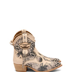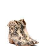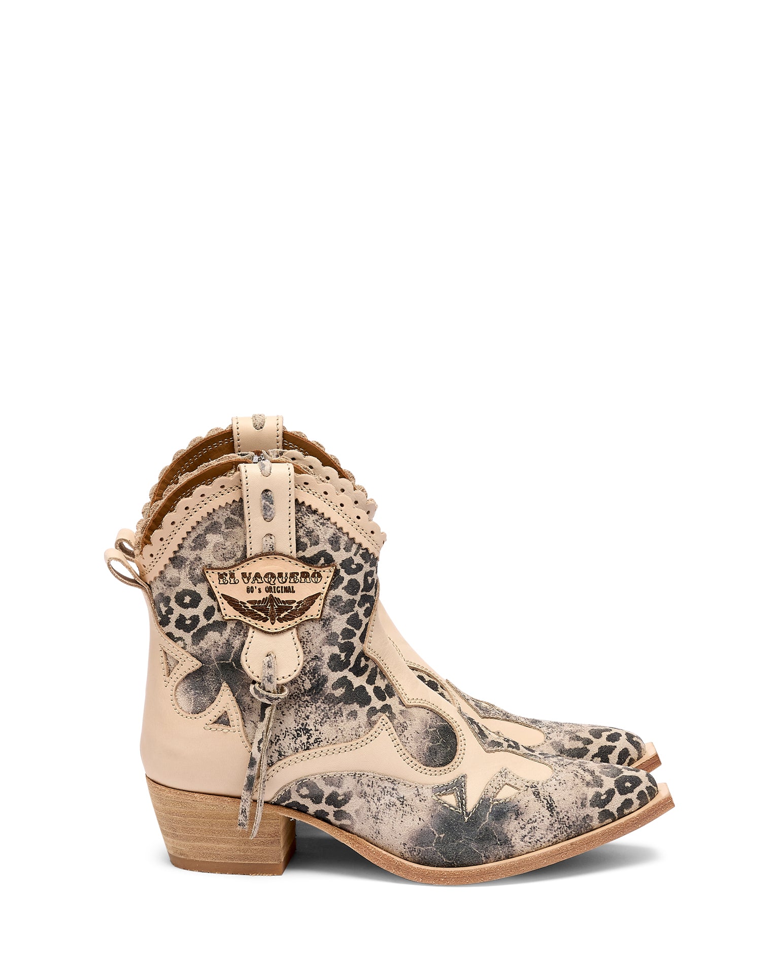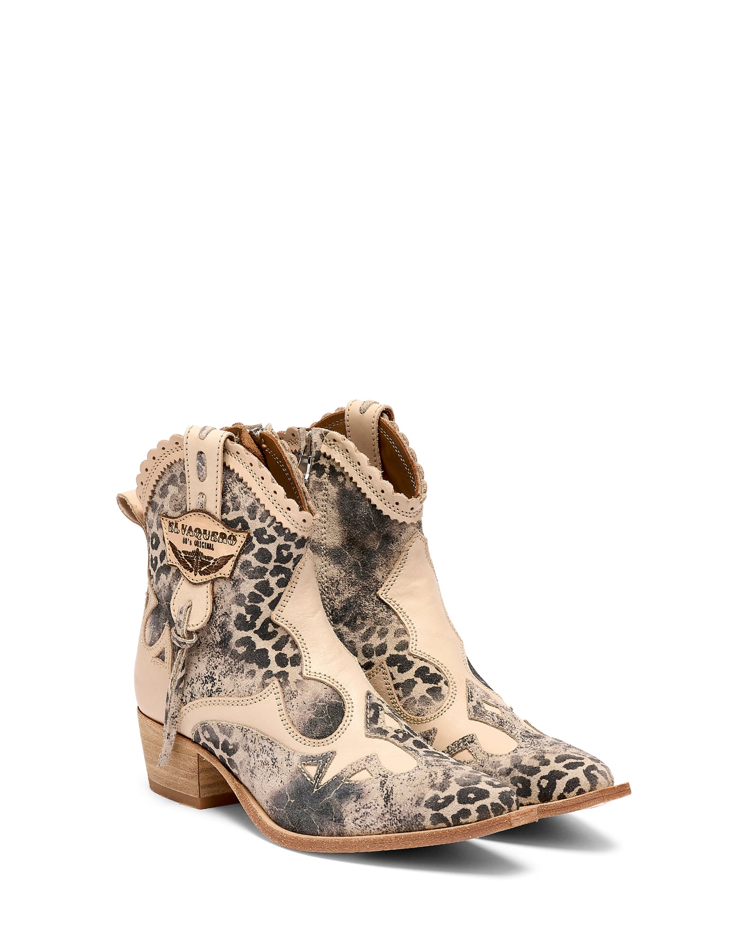 Kanya è il nuovo stivaletto texano alla caviglia di El Vaquero dal design semplice ma elegante. Realizzato con una suola in cuoio e un tacco di 4 cm, è dotato di un sottotacco in gomma antiscivolo per un comfort ottimale. Realizzato in questa pelle scamosciata con stampa leopardata effetto marmo. Un connubio originale tra selvaggia eleganza e raffinatezza artistica, per creazioni audaci e di grande impatto visivo.