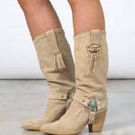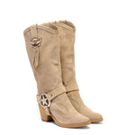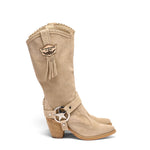 Featuring a 7 cm heel, subtle side fringes, and a distinctive star-shaped ankle gusset, the Kris cowboy boot is the perfect combination of style and elegance. Treat and gently wash with our Silverstone wash, which creates stunning color gradients on the suede. Available in this warm autumnal color with tonal details.