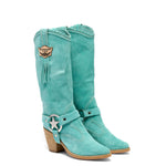 Featuring a 7 cm heel, subtle side fringes, and a distinctive star-shaped ankle gusset, the Kris cowboy boot is the perfect combination of style and elegance. Treat and gently wash with our Silverstone wash, which creates stunning color gradients on the suede. Available in this warm autumnal color with tonal details.