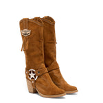 Featuring a 7 cm heel, subtle side fringes, and a distinctive star-shaped ankle gusset, the Kris cowboy boot is the perfect combination of style and elegance. Treat and gently wash with our Silverstone wash, which creates stunning color gradients on the suede. Available in this warm autumnal color with tonal details.