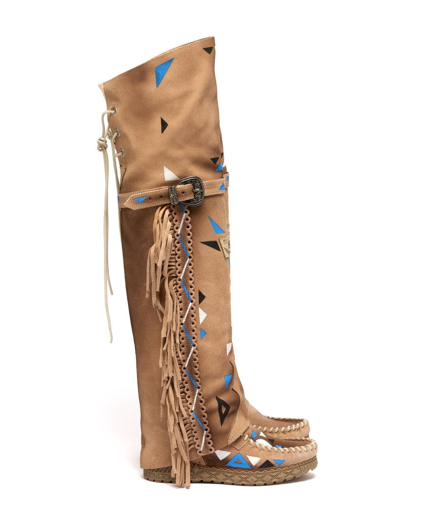 Coleen è uno di quei modelli che ogni donna El Vaquero sogna di avere — audace, iconico e profondamente artigianale. Il suo doppio gambale che supera il ginocchio, le cuciture fatte a mano, le frange laterali e il caratteristico laccio posteriore creano una silhouette libera e inconfondibile. In questa edizione limitata dipinta a mano, Coleen diventa ancora più straordinario: ogni paio viene dipinto singolarmente dal nostro artista al momento dell’acquisto, con motivi etnici unici che trasformano lo stivale in un vero pezzo da collezione da indossare.