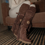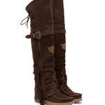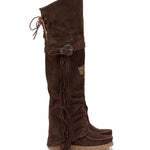 The Coleen boot is a must-have in the wardrobe of every El Vaquero aficionado. This double-shaft, over-the-knee boot features signature hand-stitched seams, beautiful side fringes, and an elegant lace-up back. Finished in the famous Silverstone wash, a signature of the El Vaquero brand, which highlights every nuance of the leather in its most intense colors and makes each boot different and one of a kind.