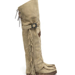 The Coleen boot is a must-have in every El Vaquero fan's wardrobe. This incredible boot features a double shaft that reaches above the knee, signature hand stitching, beautiful side fringing and a stylish lace-up back. Treated and gently washed with our Silverstone wash that creates incredible colour gradients on the suede. Available in this warm autumn colour with tonal details.