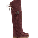 The Coleen boot is a must-have in the wardrobe of every El Vaquero fan. This double-shaft, over-the-knee boot features signature hand-stitched seams, beautiful side fringe, and an elegant lace-up back. Crafted from supple, premium ivory-white cowhide hand-selected by El Vaquero's Head Designer, the new Optical colorway creates a sleek and classy monochrome look.