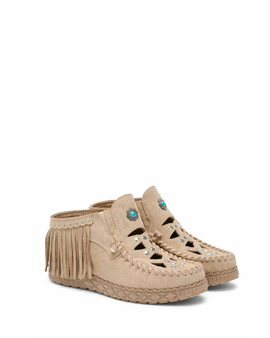 Bella è la nuova scarpa mocassino firmata El Vaquero, che unisce comfort quotidiano e autentico stile artigianale. Caratterizzata da intagli sulla tomaia, frange posteriori e cuciture fatte a mano, offre un plantare morbido e una suola in gomma per un look boho e ricercato. Realizzato in questa pelle di vitello scamosciato con finitura vintage, esaltato dal celebre lavaggio Silverstone. Ogni pelle è unica, con sfumature intense e un effetto vissuto che racconta una storia.